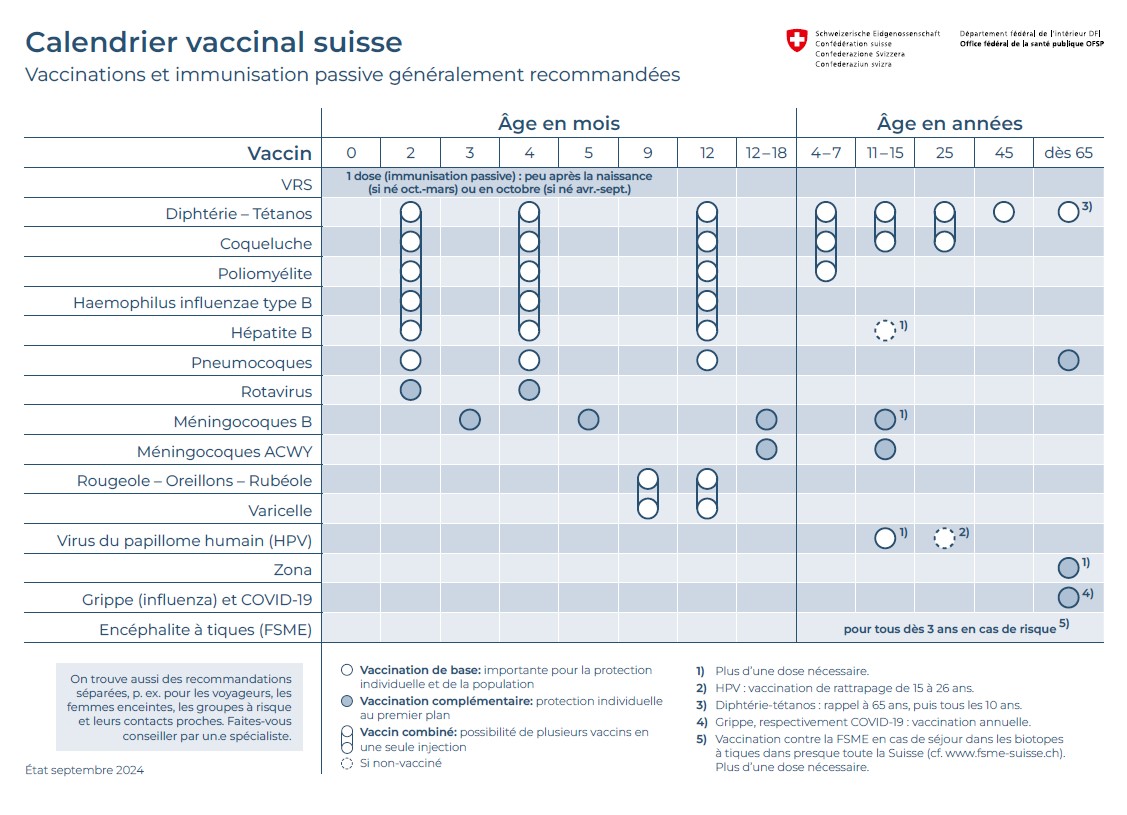 Pour les nourrissons et les enfants, l’OFSP recommande les vaccinations suivantes :