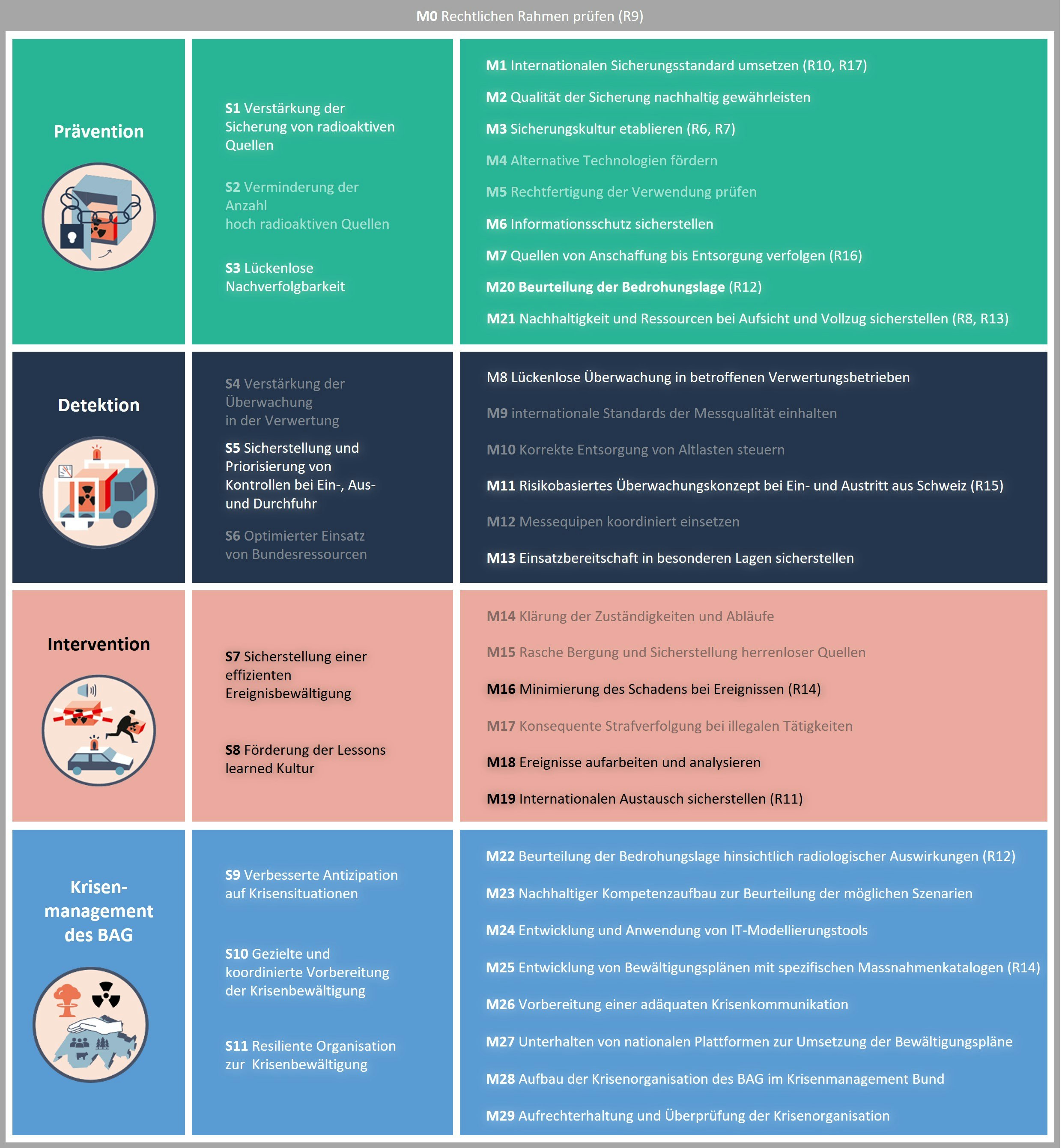 Konkret sollen sowohl der Missbrauch von radioaktivem Material zu kriminellen Zwecken als auch dessen unkontrollierte Verbreitung durch unzulässige Entsorgung oder durch illegale Ein-, Aus- und Durchfuhr verhindert werden. In den drei Aktionsfeldern «Prävention», «Detektion» und «Intervention» wurden Arbeitsgruppen gebildet, welche aus Mitgliedern mehrerer Bundesstellen (BAZG, Labor Spiez, NDB, Nuklearforensik Schweiz, fedpol, BA, NAZ, ENSI, BFE, VBS ABC-KAMIR, EDA, PSI und Suva) aus sechs Departementen bestehen. Die Aktionsfelder wurden in acht Schwerpunkte und neunzehn Massnahmen gegliedert.