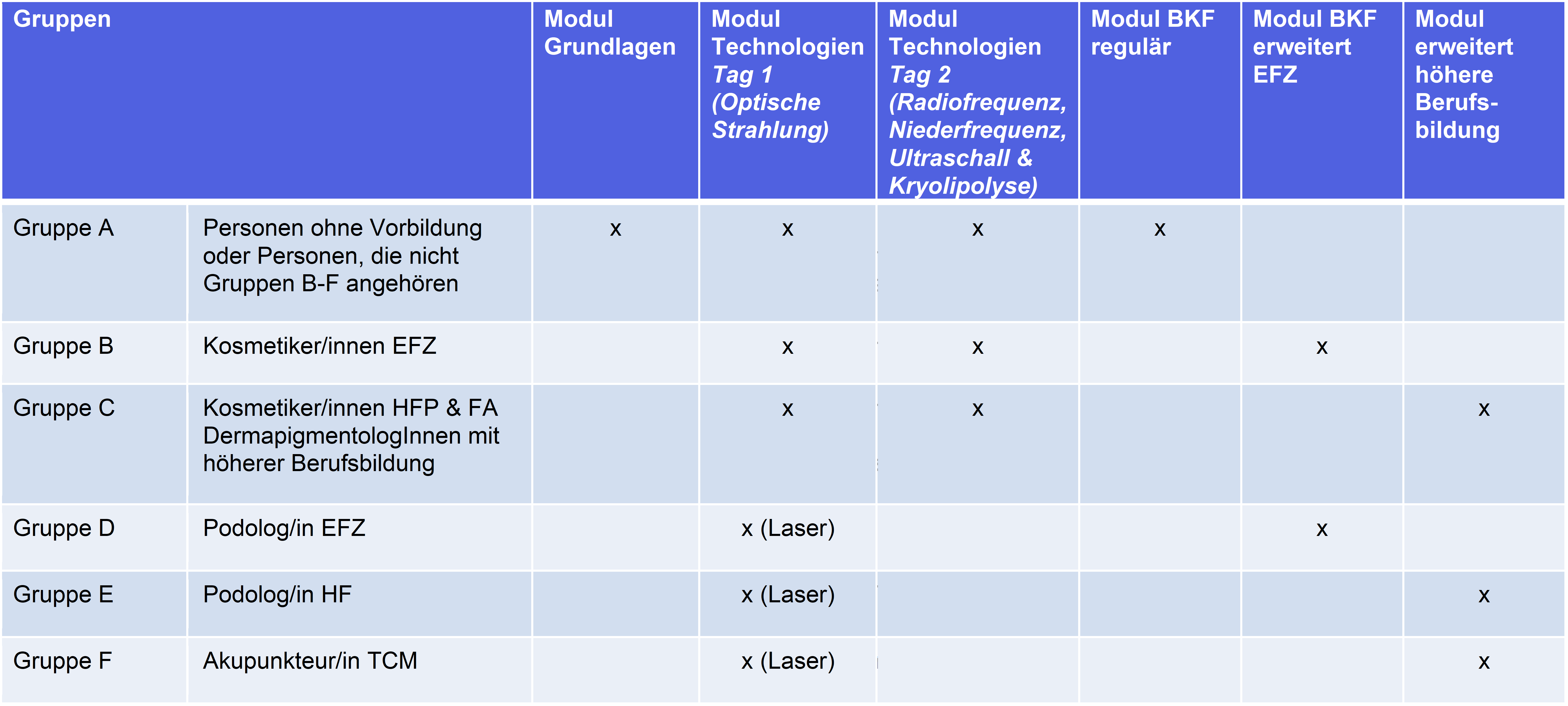 Das Modul BKF regulär richtet sich an alle Personen ohne Vorbildung, an Personen, die nicht den Gruppen B-F gemäss Tabelle 1 angehören sowie an Personen, die bereits einen Sachkundenachweis gemäss den Regeln des Prüfungsreglements der Trägerschaft erlangt haben. Module BKF regulär sind nur für kosmetische Behandlungen möglich.