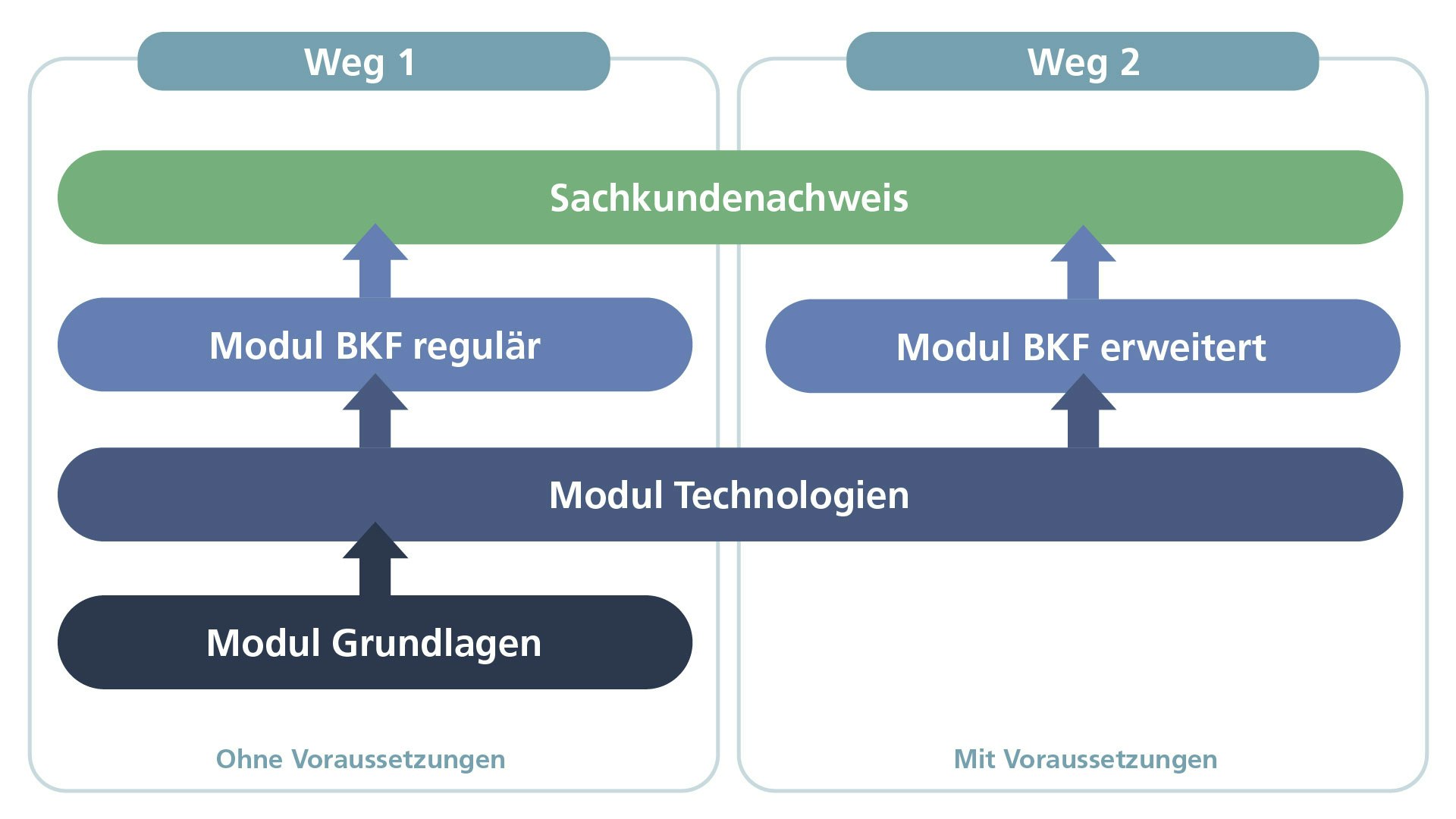 Weg 1 ist an alle Personen gerichtet, welche keine der Voraussetzungen für Weg 2 erfüllen. Hier muss als erstes das Modul Grundlagen absolviert und mit einer Prüfung erfolgreich abgeschlossen werden. Danach kann man das Modul Technologien und nach erfolgreichem Abschluss dieses Moduls das reguläre Modul behandlungsspezifische Kenntnisse und Fähigkeiten (BKF) absolvieren. Mit bestandener Prüfung des regulären Moduls BFK wird der Sachkundenachweis erworben.