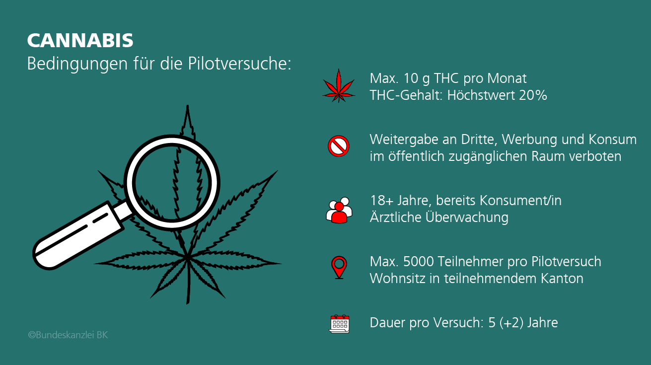 Seit dem 15. Mai 2021 ist eine Änderung des BetmG in Kraft, die Pilotversuche mit der Abgabe von Cannabis zu nicht medizinischen Zwecken («Genusszwecken») ermöglicht. Diese Studien sollen eine Grundlage für eine zukünftige gesetzliche Regelung von Cannabis liefern.