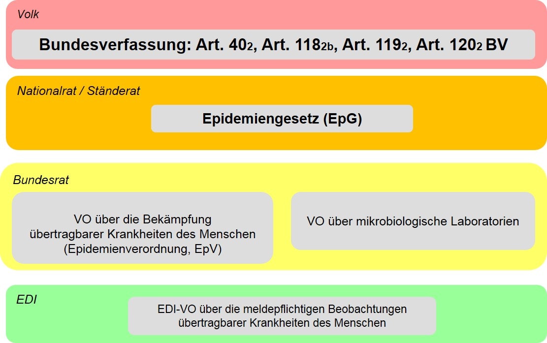 Das Bundesgesetz vom 28.09.2012 über die Bekämpfung übertragbarer Krankheiten des Menschen (Epidemiengesetz; EpG) ist seit 1.1.2016 in Kraft, und ermöglicht eine frühzeitige Erkennung, Überwachung, Verhütung und Bekämpfung.