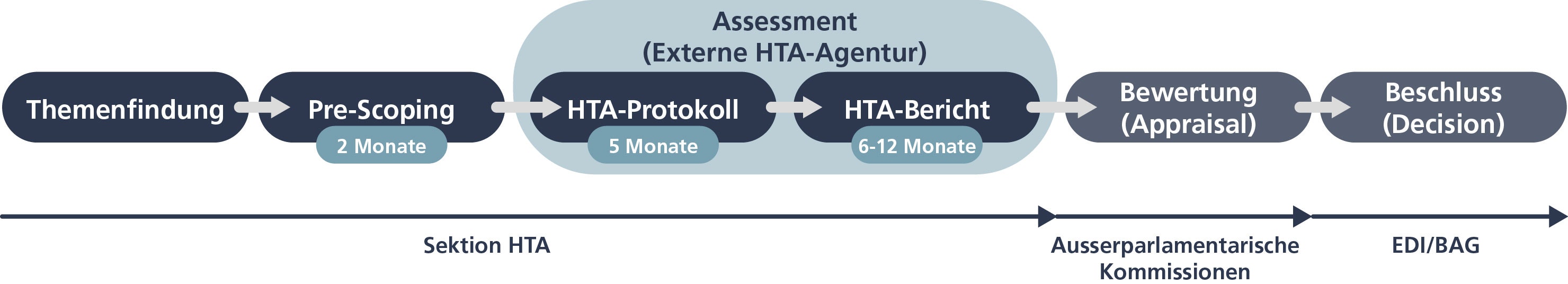 - Im HTA-Protokoll konkretisiert der externe Auftragnehmer die Fragestellung und definiert die Methodik für den anschliessenden HTA-Bericht.