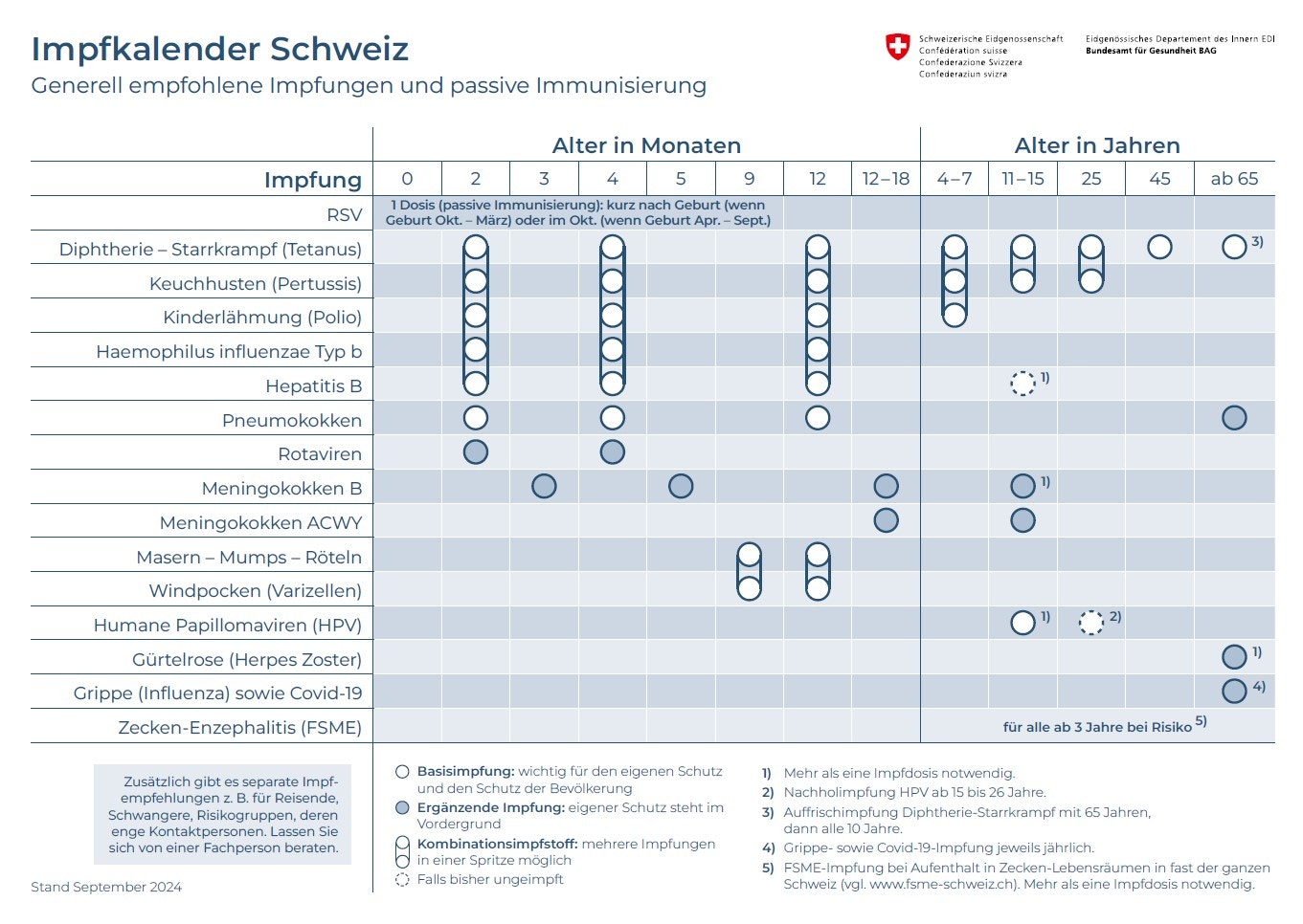 Zusätzlich zu den Basisimpfungen empfiehlt das BAG für Säuglinge und Kinder Impfungen gegen folgende Erreger: