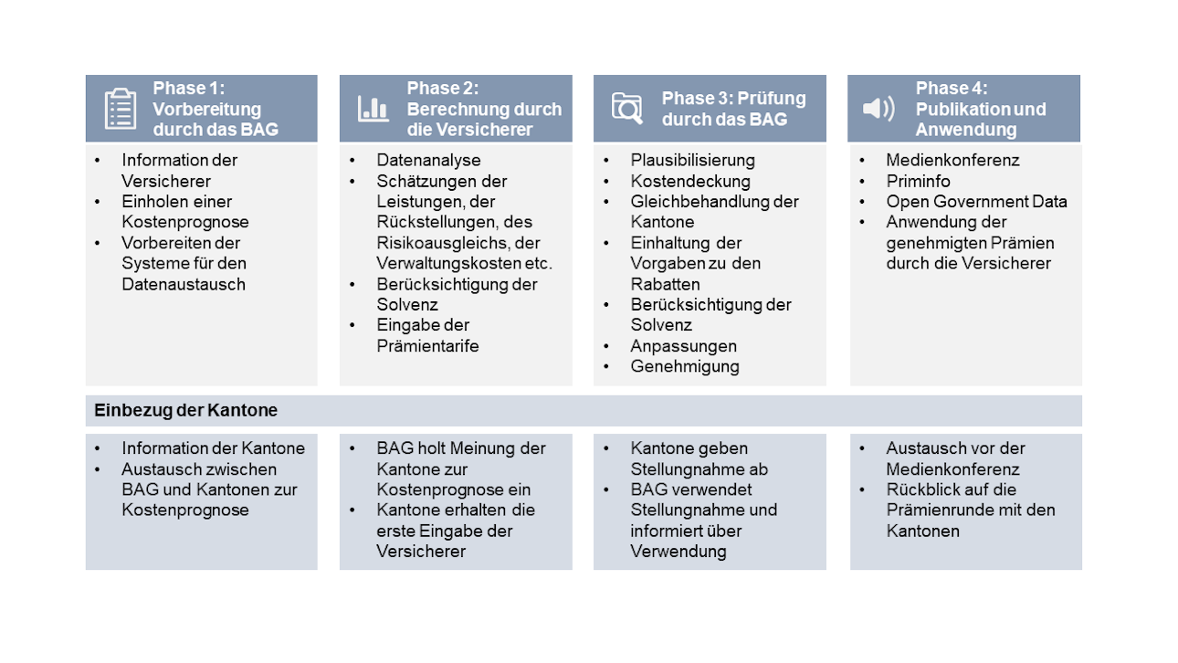 Die Prämien der Krankenversicherung werden von den Versicherern berechnet. Das BAG genehmigt und publiziert die Prämien.