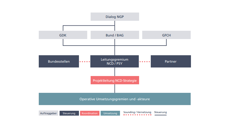 Ein Leitungsgremium koordiniert die Umsetzung der Massnahmen der NCD-Strategie. Es setzt sich zusammen aus einer Vertretung des BAG, der GDK und der Gesundheitsförderung Schweiz (GFCH). Dieses Gremium wahrt den Gesamtüberblick über sämtliche Umsetzungen und sorgt für eine abgestimmte Kommunikation. Es zieht Partner und Bundesstellen mit ein.