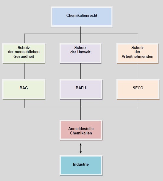 Zentrale Anlauf- und Verfügungsstelle für das Gewerbe und die Industrie ist die gemeinsame Anmeldestelle des BAG, BAFU und SECO. Für die Zulassung von Pflanzenschutzmitteln ist die Zulassungsstelle des BLW zuständig.