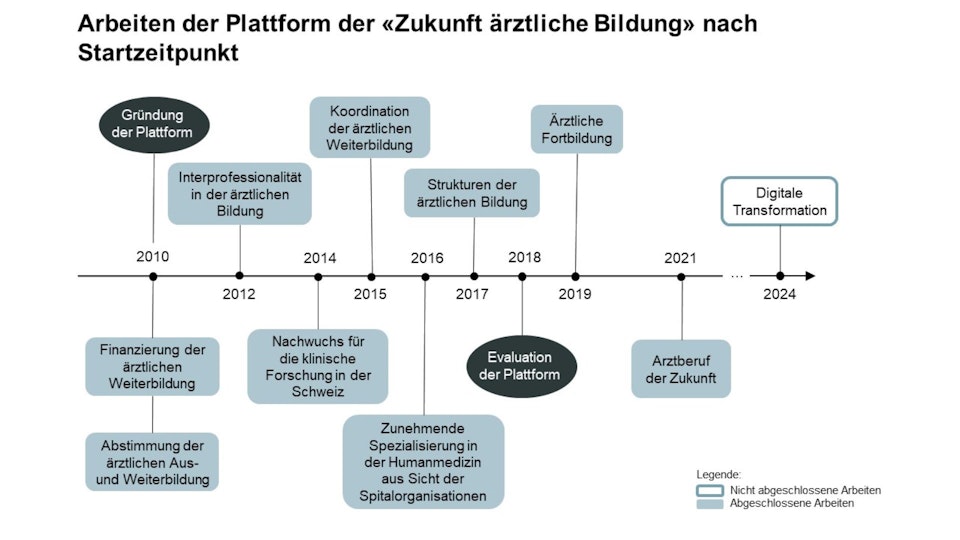 Seit April 2010 betreibt das BAG die Plattform «Zukunft ärztliche Bildung». Ziel ist es, aktuelle Themen der ärztlichen Bildung zusammen mit den Partnerorganisationen koordiniert anzugehen und konkrete Lösungsansätze zu erarbeiten. Die Plattform wurde im Sommer 2018 evaluiert.