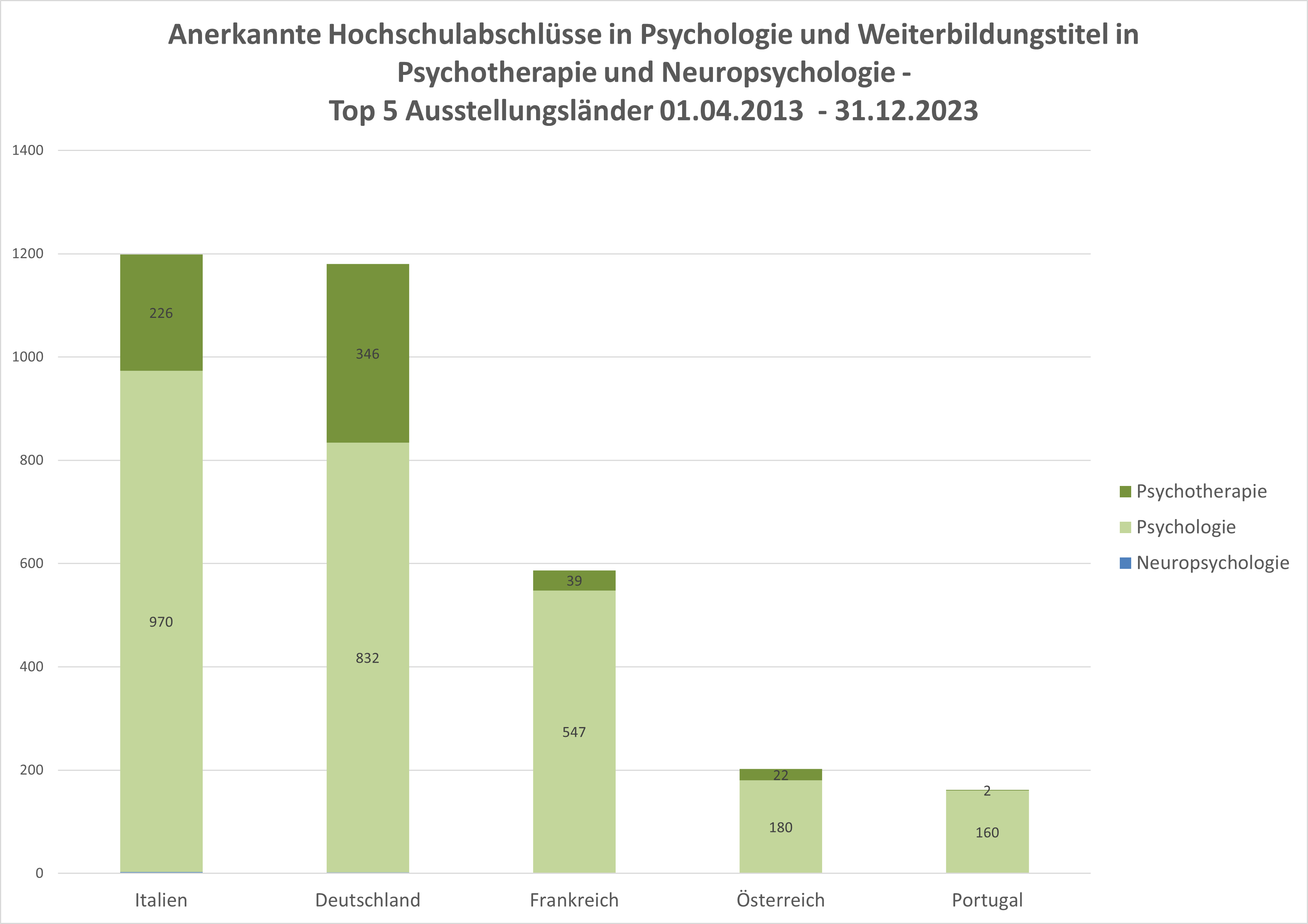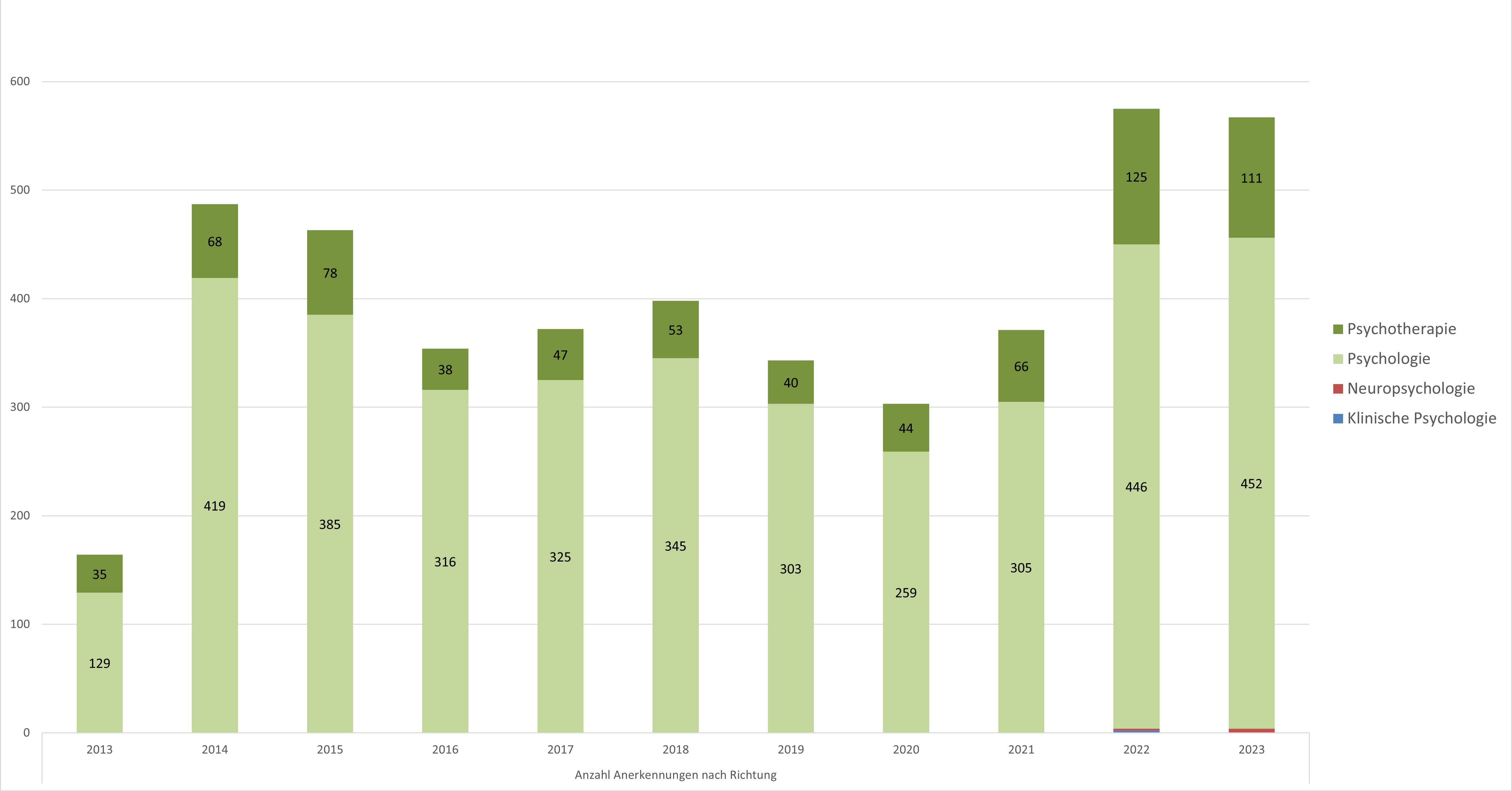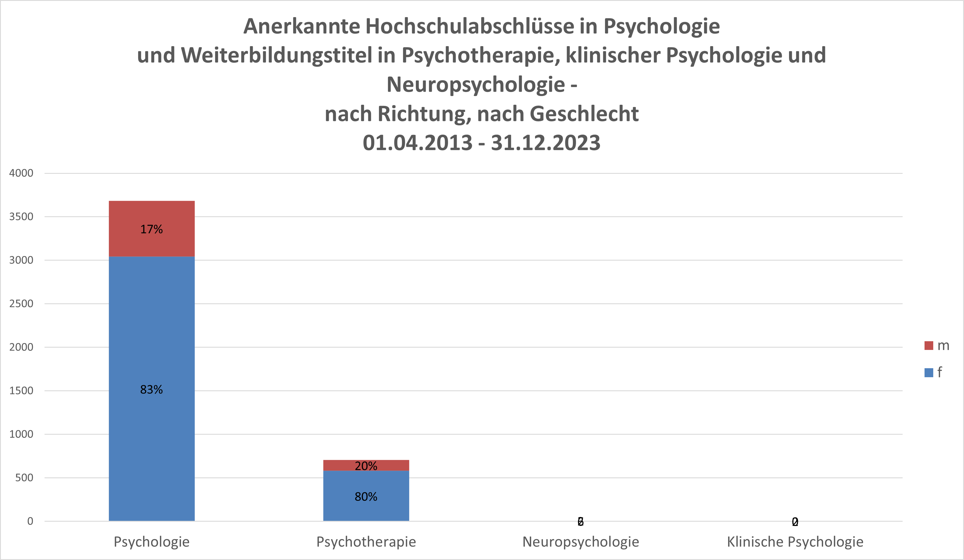 Vom 1. April 2013 bis zum 31. Dezember 2023 wurden insgesamt 3683 Hochschulabschlüsse in Psychologie und 706 Weiterbildungstitel anerkannt.