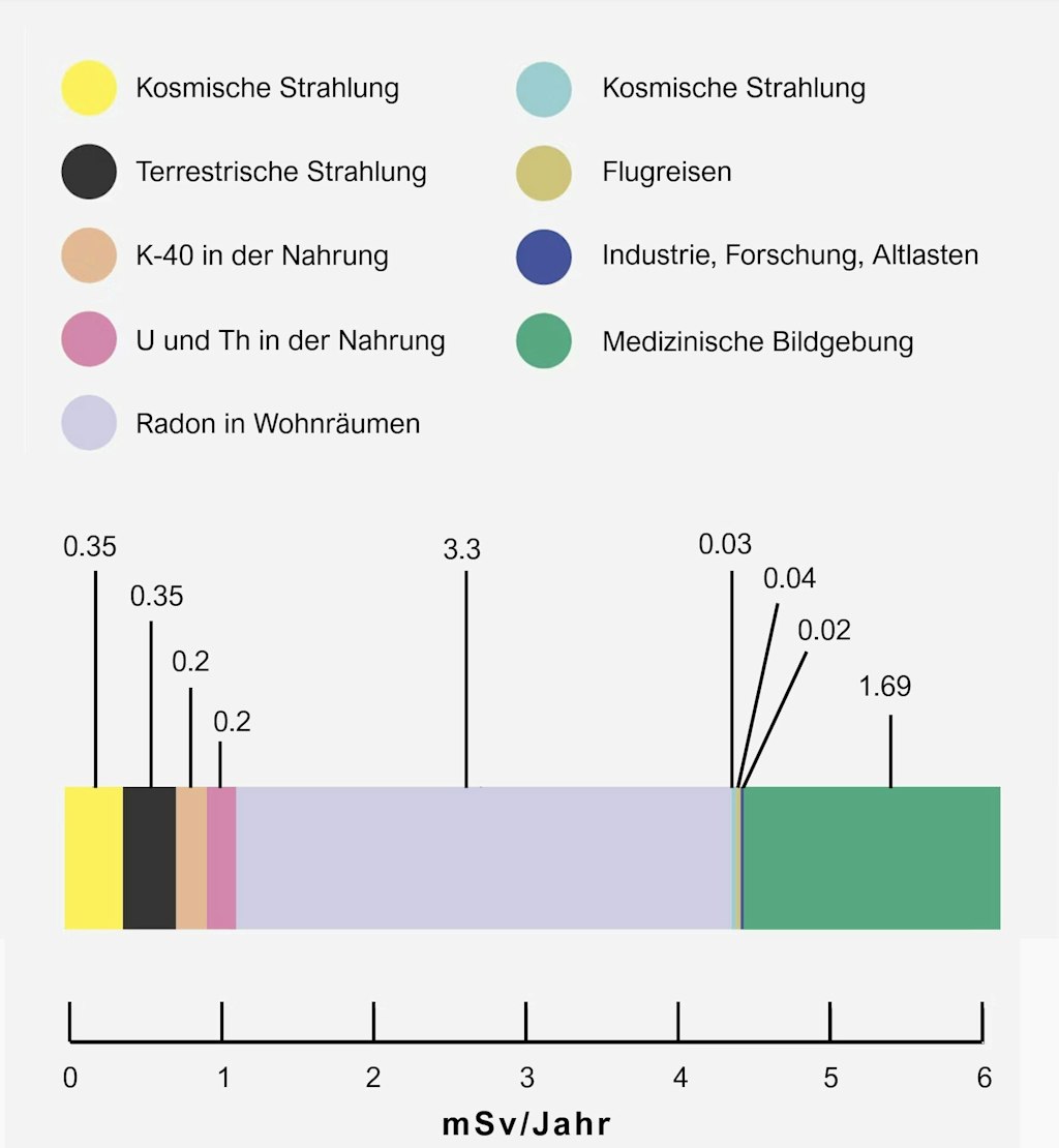 Die durchschnittlichen Beiträge der verschiedenen Expositionsquellen sind in Abbildung 1 zusammengefasst. Die durchschnittliche effektive Dosis, die die Schweizer Bevölkerung aus allen Expositionsquellen zusammen erhält, beläuft sich auf rund 6 mSv/Jahr.