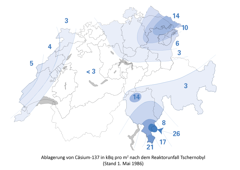 Die Messungen von Umweltproben (Boden, Gras und Lebensmitteln) sowie die direkte Bestimmung der vom menschlichen Körper aufgenommenen Radioaktivität waren für die Behörden eine unerlässliche Grundlage, um auf die Situation reagieren zu können. Es ging dabei um die Umsetzung von Schutzmassnahmen und um Informationen, die den Anfragen und den Bedürfnissen der Bevölkerung gerecht wurden (BAG, 1986). Die 2006 veröffentlichten Resultate und Lehren daraus (BAG, 2006) haben noch heute Gültigkeit, denn auch 30 Jahre nach dem Unfall sind noch immer Spuren der Ablagerungen von Tschernobyl messbar (siehe Abbildung).