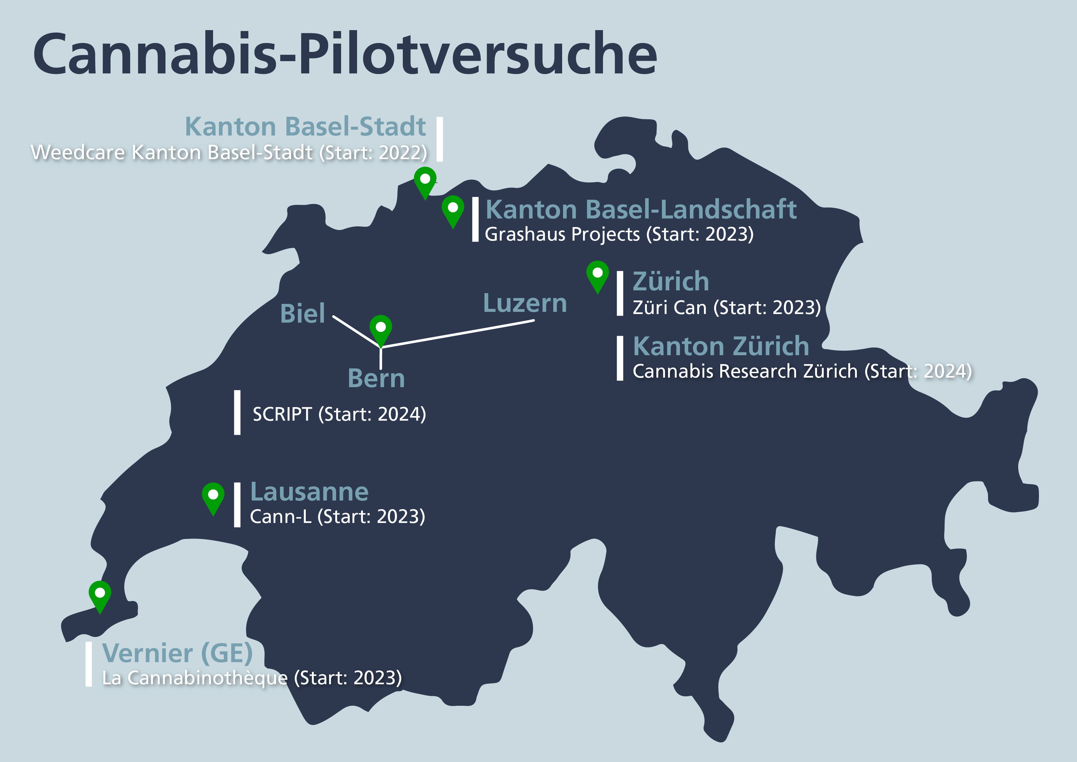 In der Schweiz sind in allen grösseren Städten Pilotversuche mit Cannabis geplant. Die unterschiedlichen Organisatorinnen und Organisatoren planen eine Abgabe von Cannabis in Apotheken, in Cannabis Social Clubs, in nicht-gewinnorientierten Läden und mittels anderen Vertriebskanälen. Die Pilotversuche ermöglichen damit unter anderem einen Vergleich unterschiedlicher Vertriebssysteme und zeigen auf, welche Regelungsmodelle von den Konsumierenden und der Bevölkerung akzeptiert werden.