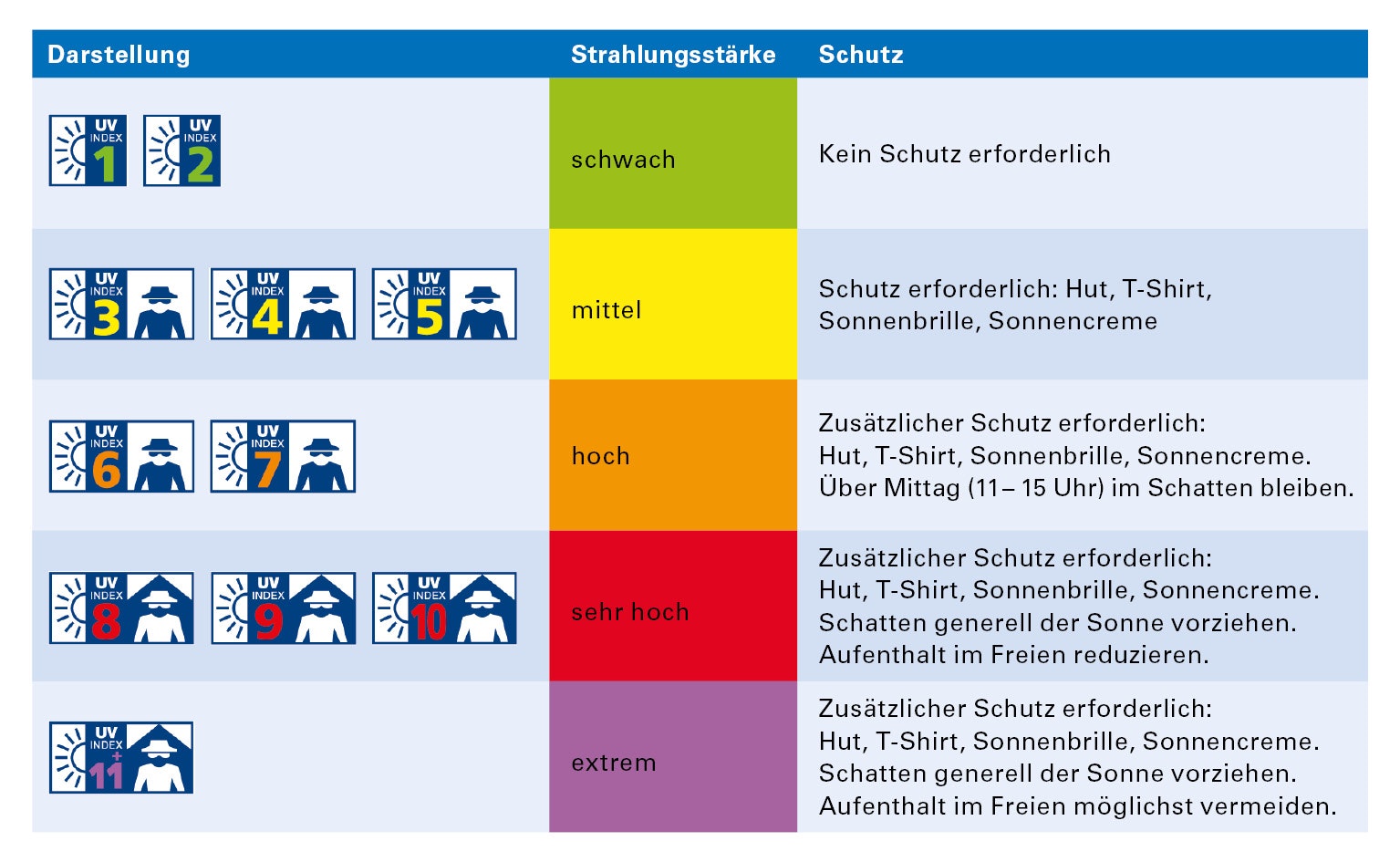Der UV-Index wird mit einer Zahl und einer Legende dargestellt. Die Zahl gibt die Stärke der UV-Strahlung an, die Legende daneben weist auf die geeigneten Schutzmassnahmen für den entsprechenden Wert hin. Je höher der UV-Index, desto besser müssen wir uns schützen.