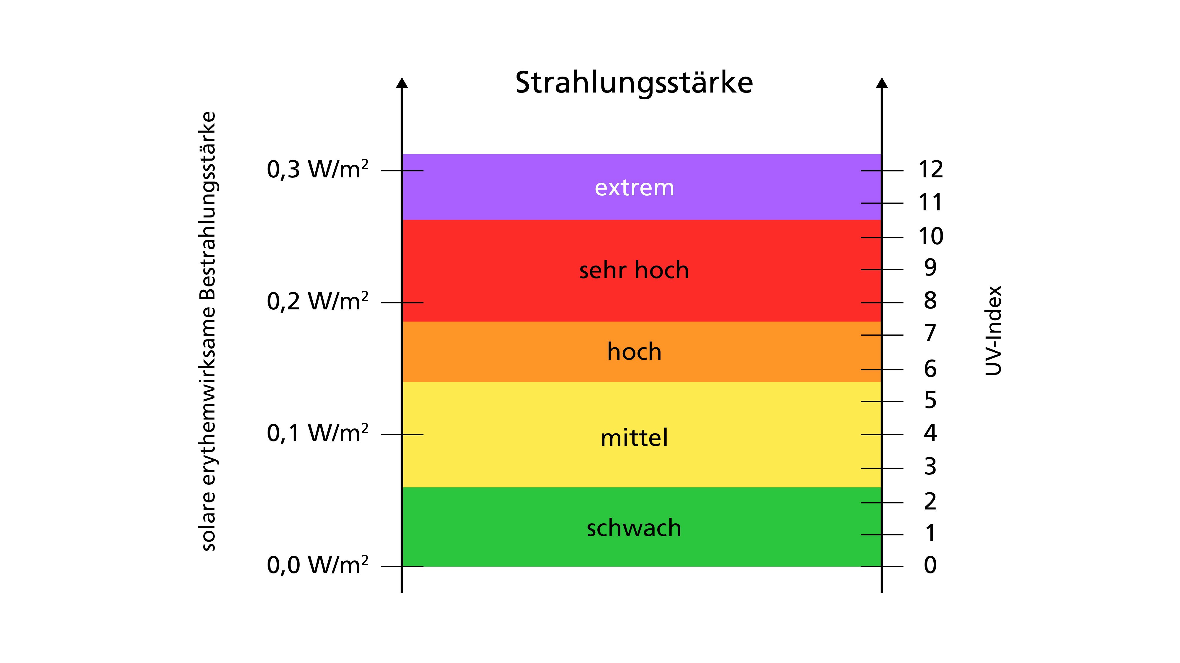 Je höher der UV-Index, desto stärker und schädlicher ist die Sonnenstrahlung. Mithilfe des UV-Index können wir die Sonnenstrahlung besser einschätzen und uns mit geeigneten Massnahmen vor den Gefahren der UV-Strahlung schützen.