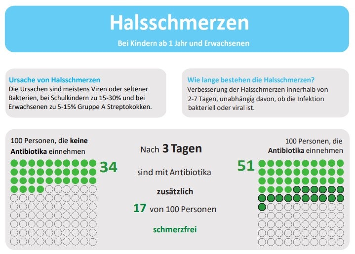 Das Berner Institut für Hausarztmedizin (BIHAM) hat evidenzbasierte Ärzteinformationen und Entscheidungshilfen erstellt, die Haus- und Kinderärztinnen und -ärzte und ihre Patientinnen und Patienten bei der partizipativen Entscheidungsfindung bezüglich Antibiotikavergabe unterstützen. Einfach verständliche Grafiken zeigen die Vor- und Nachteile einer Therapie mit und ohne Antibiotika bei Tonsillopharyngitis, Otitis Media, Harnwegsinfekten, akutem infektiösem Husten und Rhinosinusitis. Die Hilfen eignen sich auch optimal als Denkanstoss und Trainingshilfe in Qualitätszirkeln. Sie sind abrufbar unter biham.unibe.ch/entscheidhilfen.