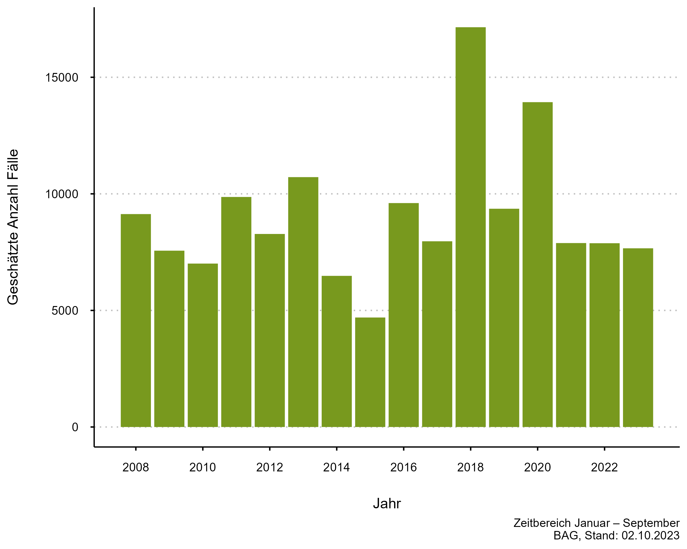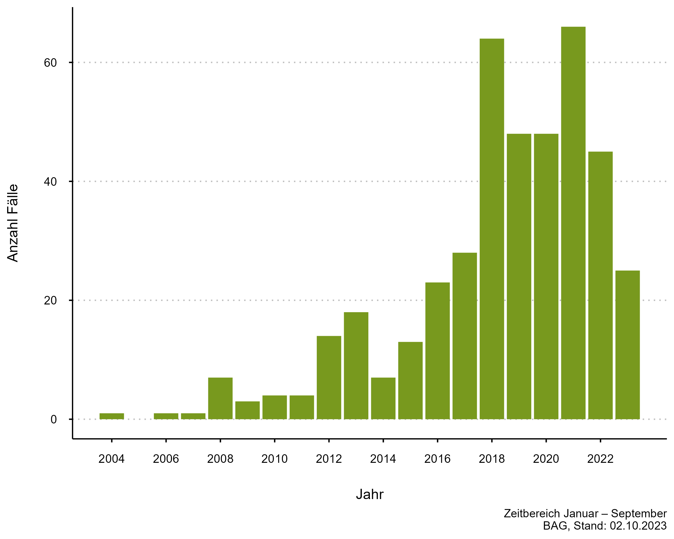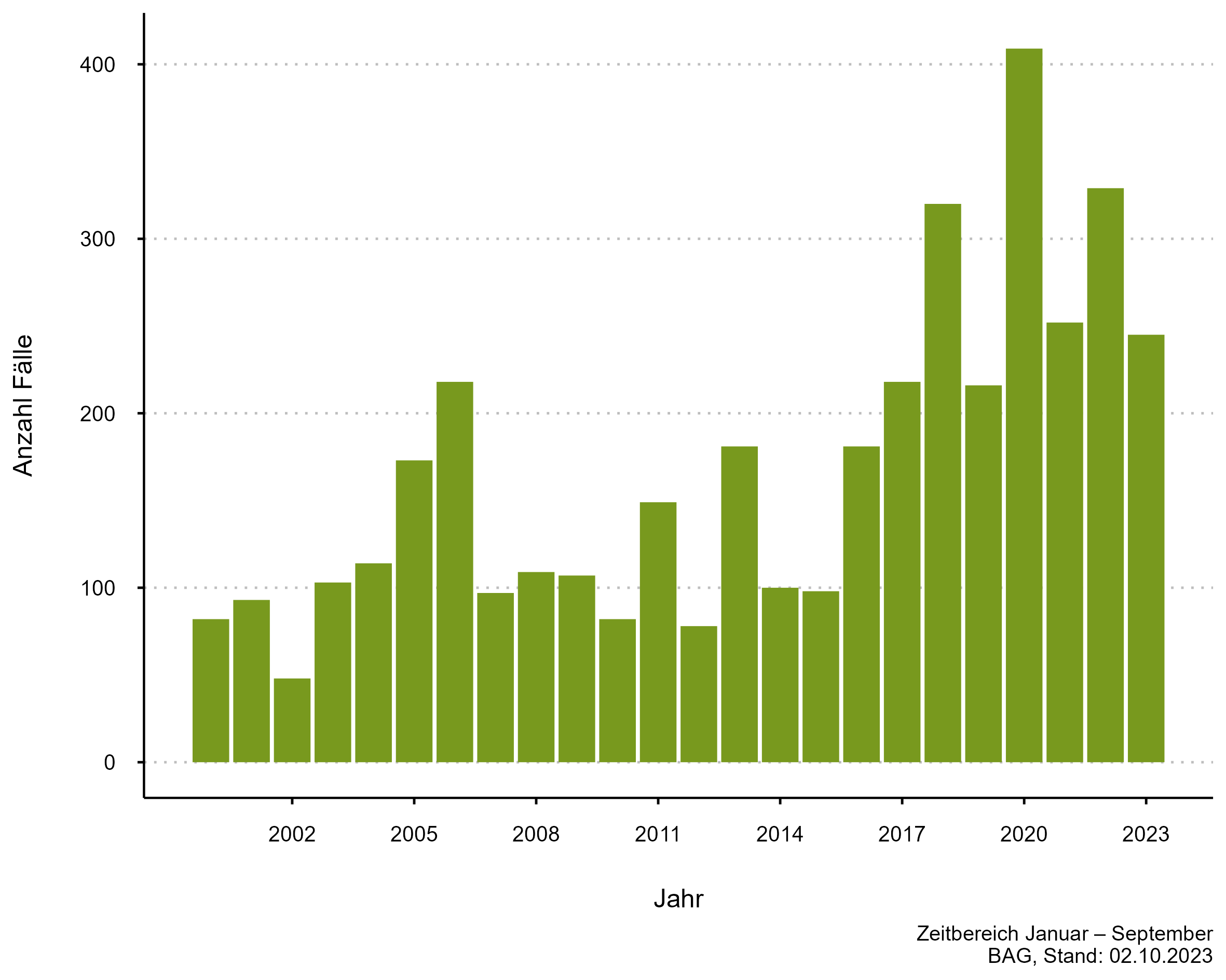 Im Monat September 2023 wurden 13 Fälle verzeichnet und somit eine vergleichbare Anzahl wie in den beiden Vorjahren. Die Summe der Fälle, kumuliert ab Januar eines Kalenderjahrs bis zum Monat vor Erscheinen des Berichts, variiert ebenfalls von Jahr zu Jahr stark (Abbildung 2). Seit 2000 wurden im gleichen Zeitraum jeweils zwischen 48 und 409 Fälle gemeldet. Bis Ende September 2023 wurden 245 Fälle registriert (Abbildung 2).