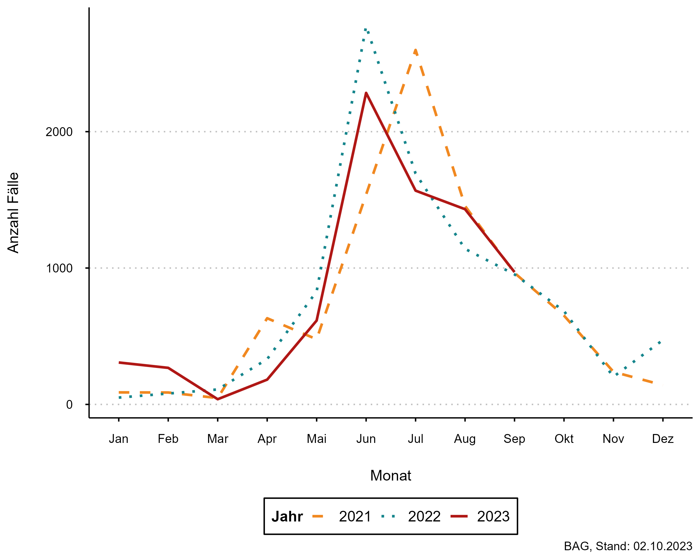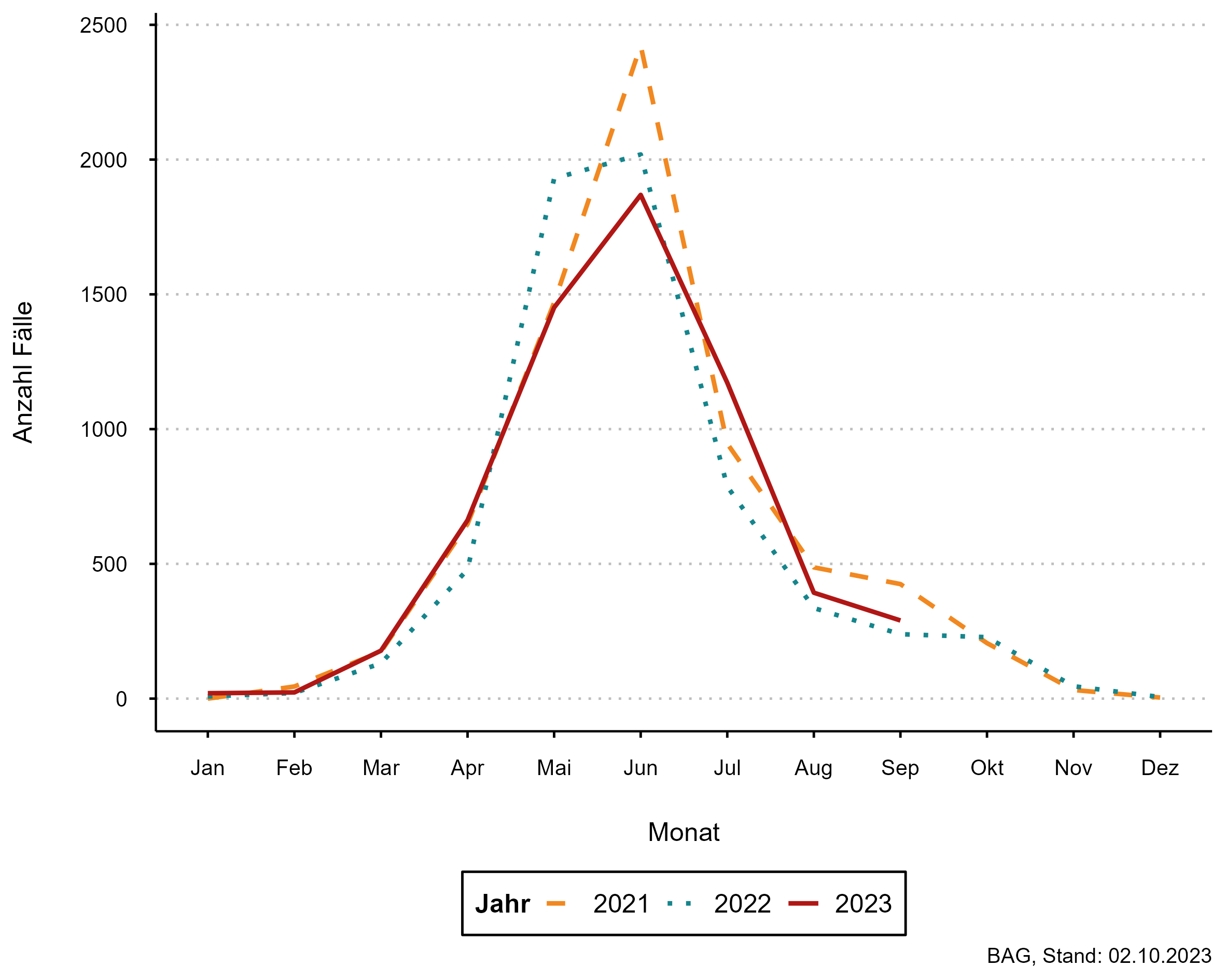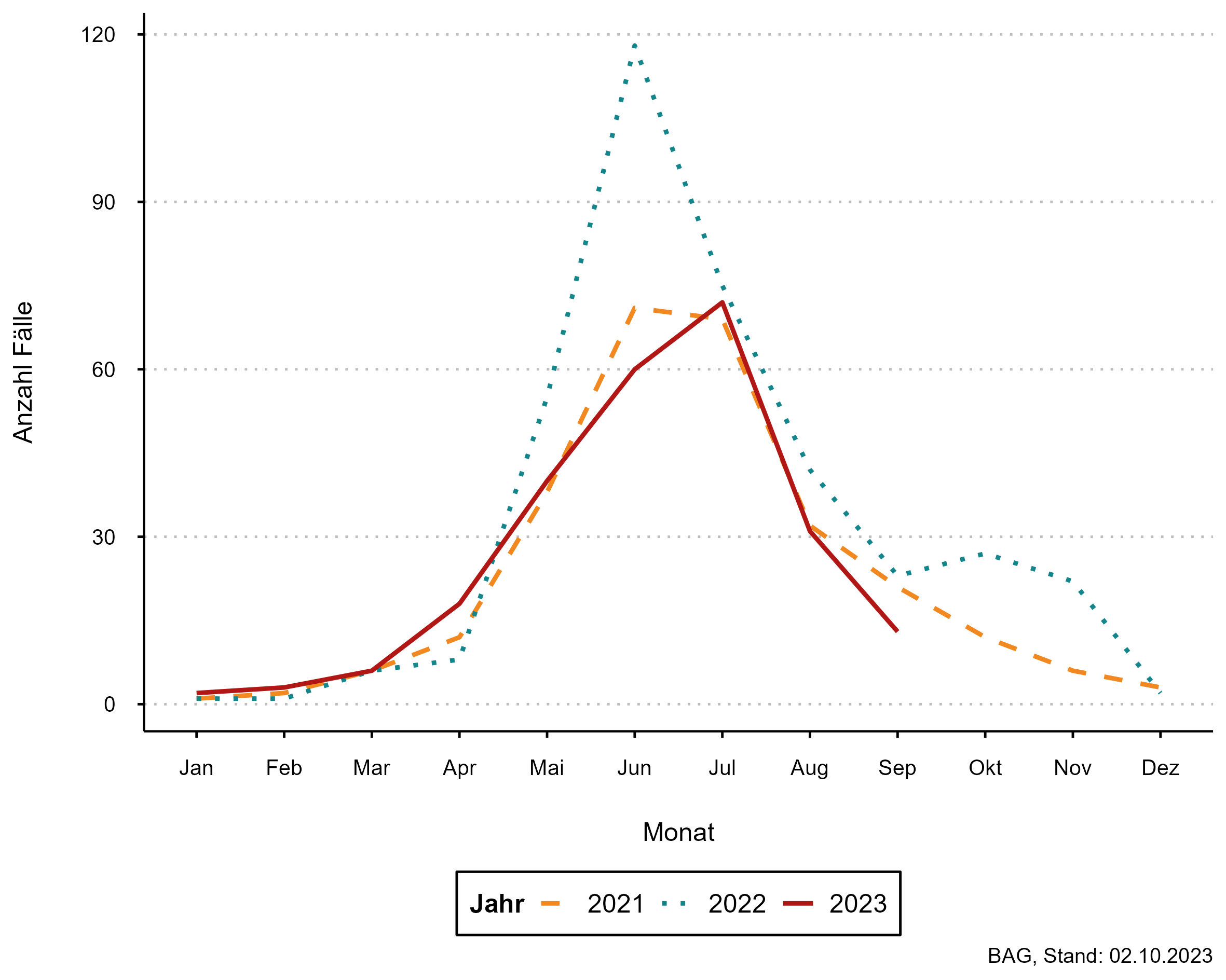 Im Monat September 2023 wurden 13 Fälle verzeichnet und somit eine vergleichbare Anzahl wie in den beiden Vorjahren. Die Summe der Fälle, kumuliert ab Januar eines Kalenderjahrs bis zum Monat vor Erscheinen des Berichts, variiert ebenfalls von Jahr zu Jahr stark (Abbildung 2). Seit 2000 wurden im gleichen Zeitraum jeweils zwischen 48 und 409 Fälle gemeldet. Bis Ende September 2023 wurden 245 Fälle registriert (Abbildung 2).