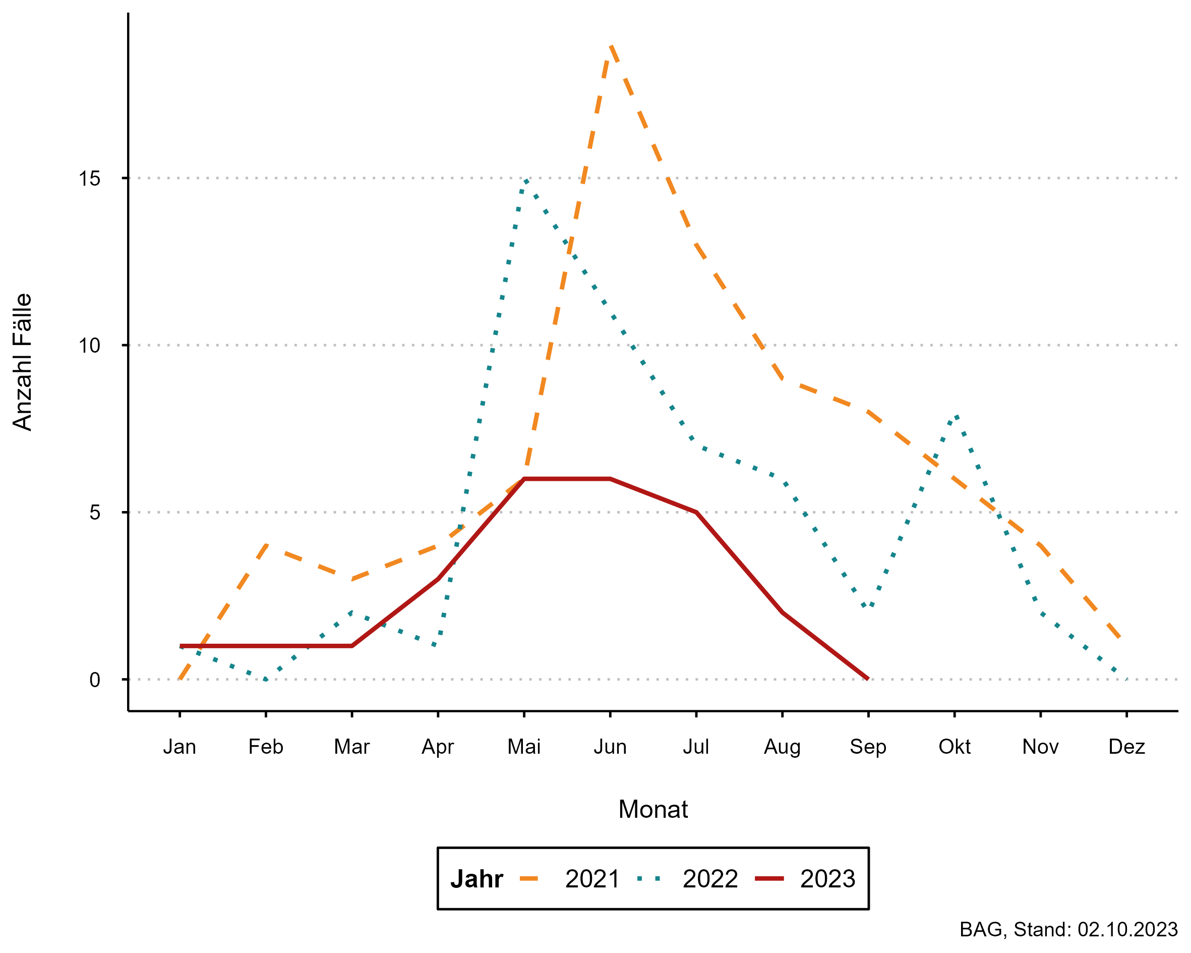 Die Tularämie untersteht seit 2004 der Meldepflicht. Zudem sind Angaben zur Ursache der Erkrankung verfügbar. Diese Auswertung beschränkt sich auf diejenigen Fälle, bei denen ein Zecken- oder Insektenstich die wahrscheinlichste Ursache der Erkrankung ist. Von Januar 2021 bis September 2023 wurden bei 41,9 Prozent Prozent der Tularämie-Fälle ein Zecken- und/oder Insektenstich als Übertragungsweg gemeldet. Im gleichen Zeitraum wurde in 30,3 Prozent Prozent der Fälle eine Exposition gegenüber wilden Tieren, einer Quelle mit nicht trinkbarem Wasser oder dem Einatmen von Staub oder Aerosolen in landwirtschaftlicher Umgebung angegeben. In 27,8 Prozent Prozent der Fälle war die Exposition zum Pathogen allerdings unbekannt. Die monatlichen Tularämie-Fallzahlen weisen ansatzweise einen wellenförmigen Verlauf auf. Auch sie unterliegen sowohl innerhalb einer Saison als auch im Vergleich zu anderen Jahren grossen Schwankungen (Abbildung 5). So wurde im Monat September 2023 kein Fall verzeichnet, deutlich weniger als in den beiden Vorjahren.
