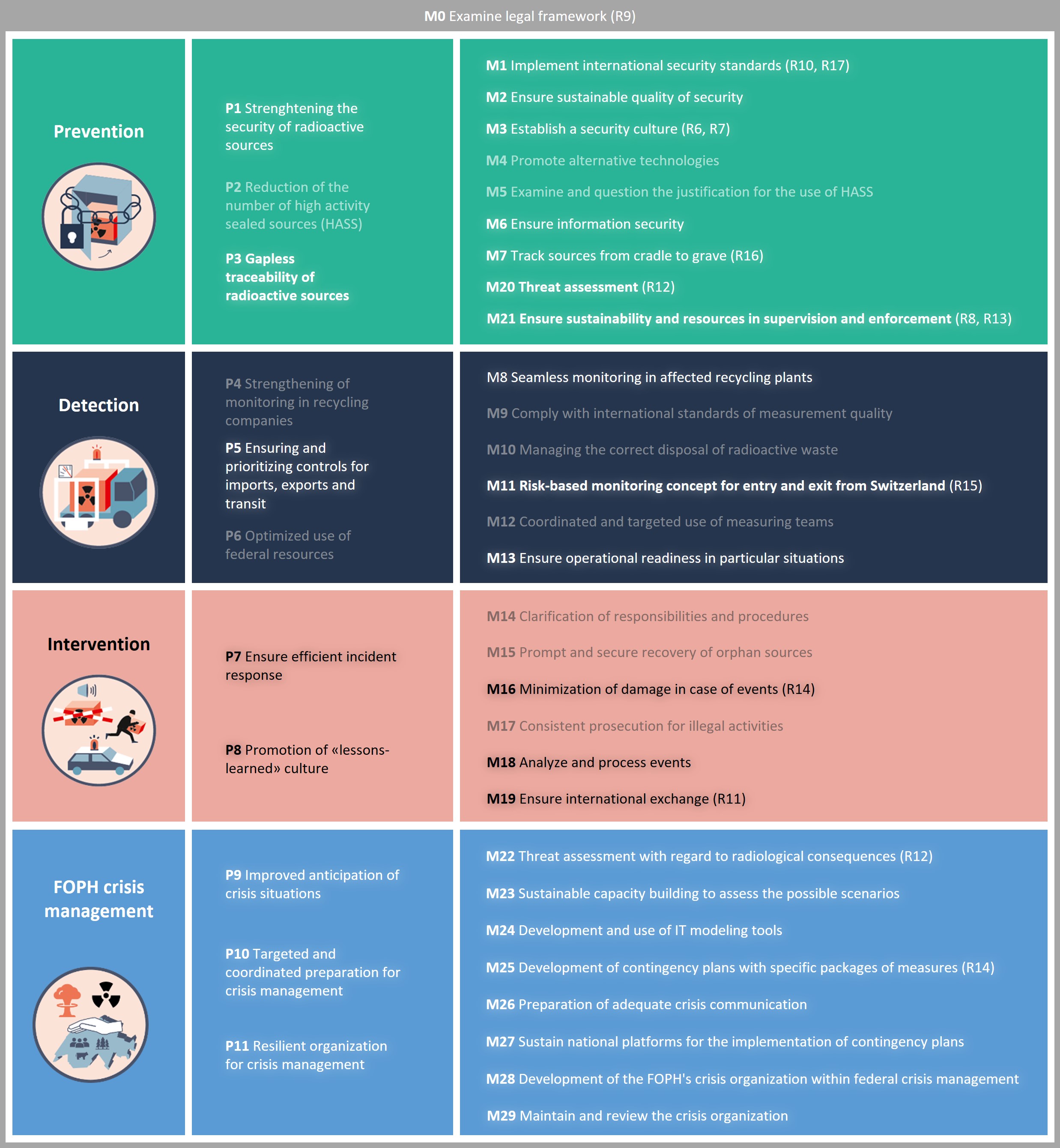 The action plan to strengthen radiological security and safety 2020-2025 ("Radiss") led by the FOPH was adopted by the Federal Council on October 21, 2020. The main objective is to improve the security of radioactive materials, to keep licensed radioactive material under constant control and to detect orphan radioactive material before it can cause damage to people and the environment.