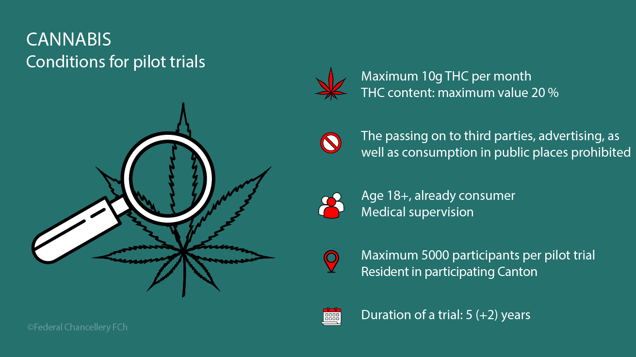 The FOPH can grant authorisations for scientific pilot trials involving the controlled dispensing of non-medicinal cannabis that are limited in time, place and scope, provided new insights into cannabis use can be gained.