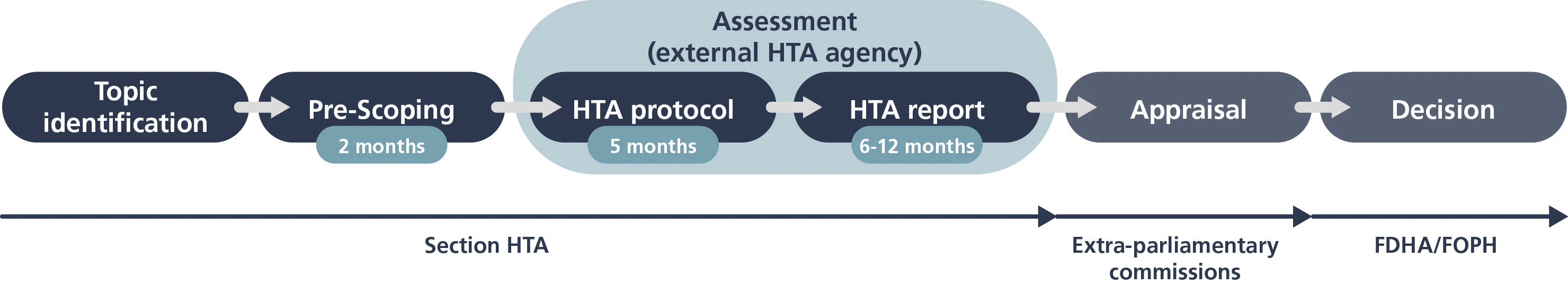 - The Federal Commissions appraise the HTA report and submit a recommendation to the Federal Department of Home Affairs (FDHA) or, in the case of medicines, to the FOPH.