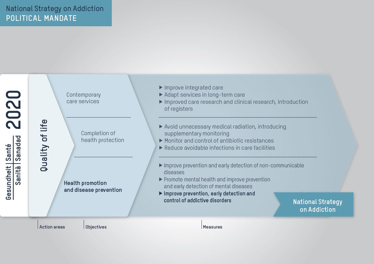 As part of the Federal Council's Health2020 initiative, the Federal Office of Public Health (FOPH) and its partners have developed the National Strategy on Addiction. The strategy was adopted by the Swiss Federal Council in November 2015. For the first time, it creates a comprehensive orientation and action framework for stakeholders at all federal levels in the field of addiction and in related areas of social and health policy. It serves experts and service providers as a starting point for their addiction-specific activities and projects.