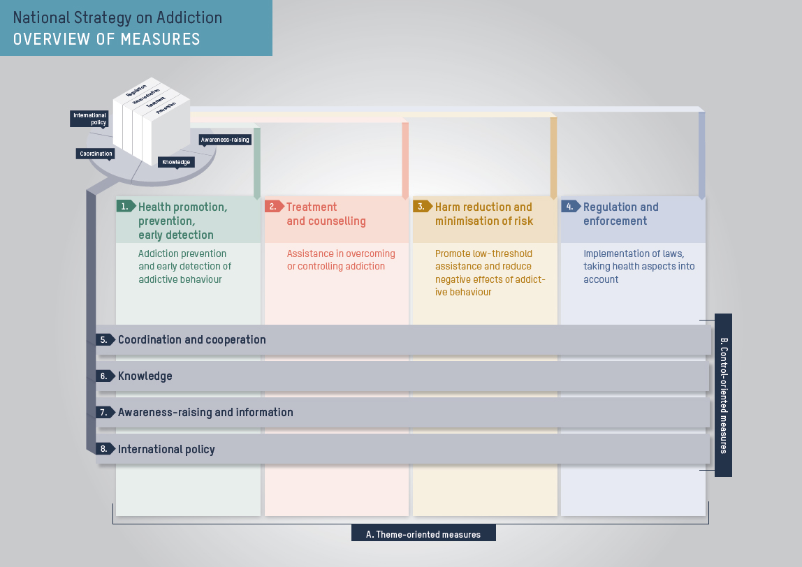 The National Strategy on Addiction is based on the balance between personal responsibility and support for people with an addiction. It further develops Switzerland's successful addiction policy with its four pillars of prevention, therapy and counseling, harm reduction and regulation. It is integral, cross-addiction and non-substance-related. It aims to strengthen the prevention of addiction and its early detection and to ensure the long-term treatment of people with an addiction. With the National Strategy on Addiction, the Federal Council has created the basis for taking measures not only for drug, alcohol and tobacco-related forms of addiction but also for other forms of addiction such as drug addiction, addictive online behavior and gambling addiction.