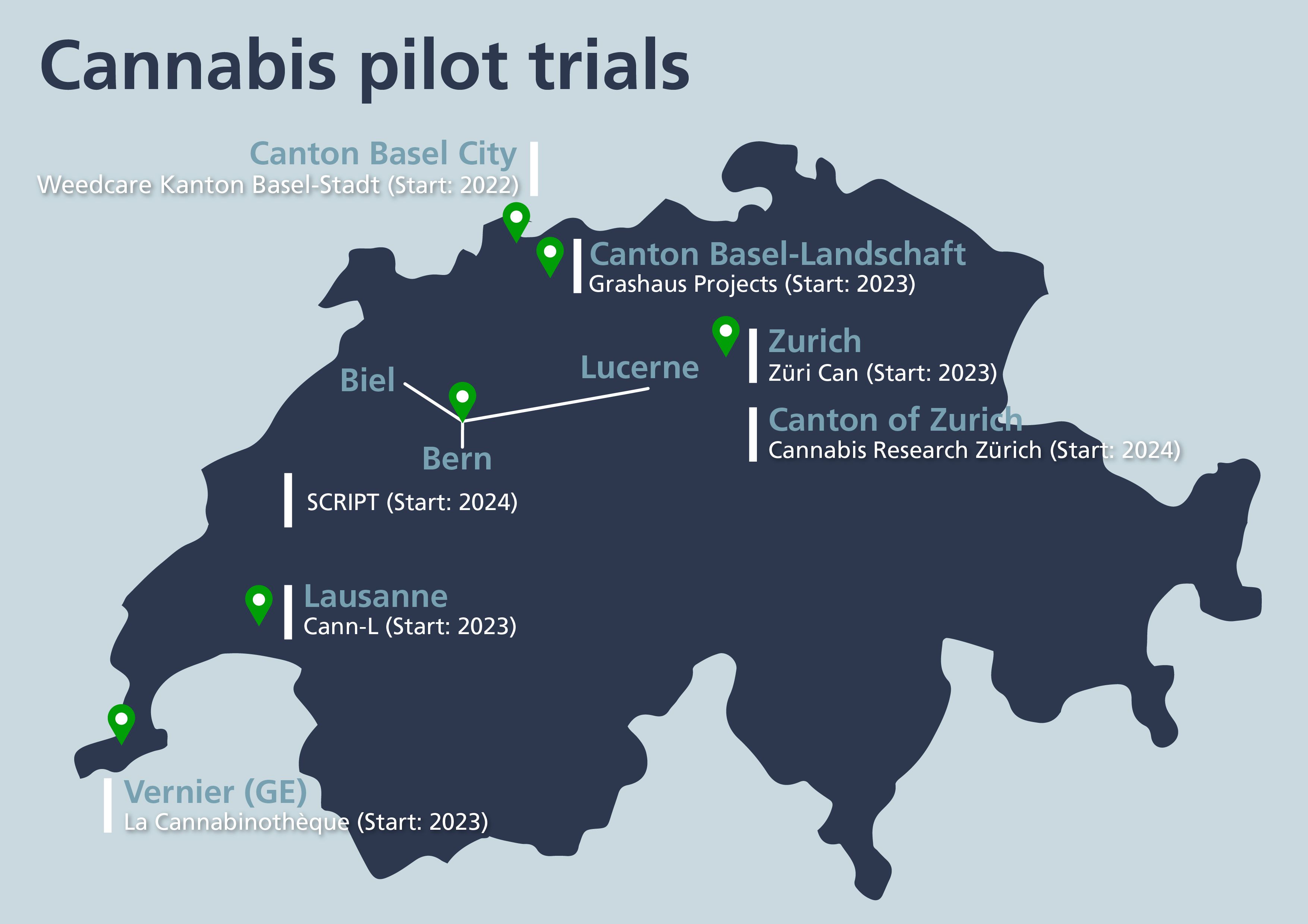 In Switzerland, pilot trials with cannabis are planned in all major cities. The various organisers are planning to distribute cannabis in pharmacies, cannabis social clubs and non-profit stores as well as via other distribution channels. The pilot trials will thus allow for, among other things, a compari-son of the different distribution systems and show which regulatory models are accepted by consumers and the population.