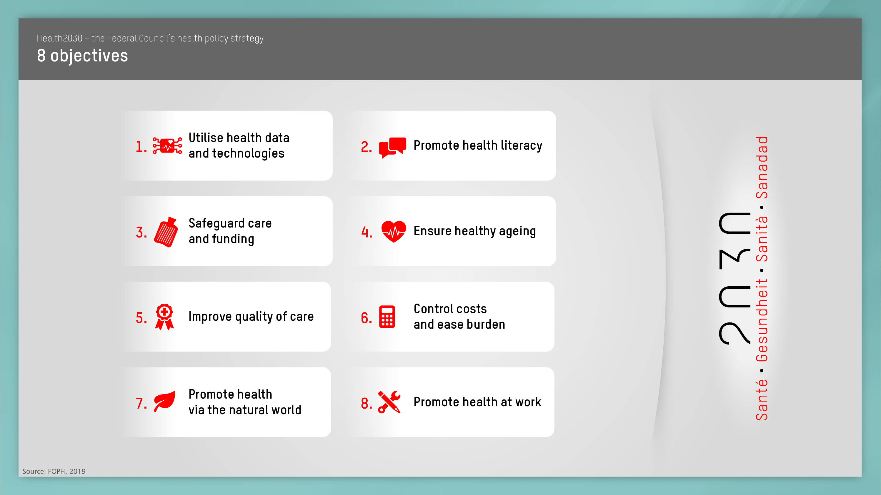 Everyone in Switzerland should continue to benefit from high-quality, affordable healthcare. In the Health2030 Strategy, you can find out how the Federal Council intends to achieve this goal.