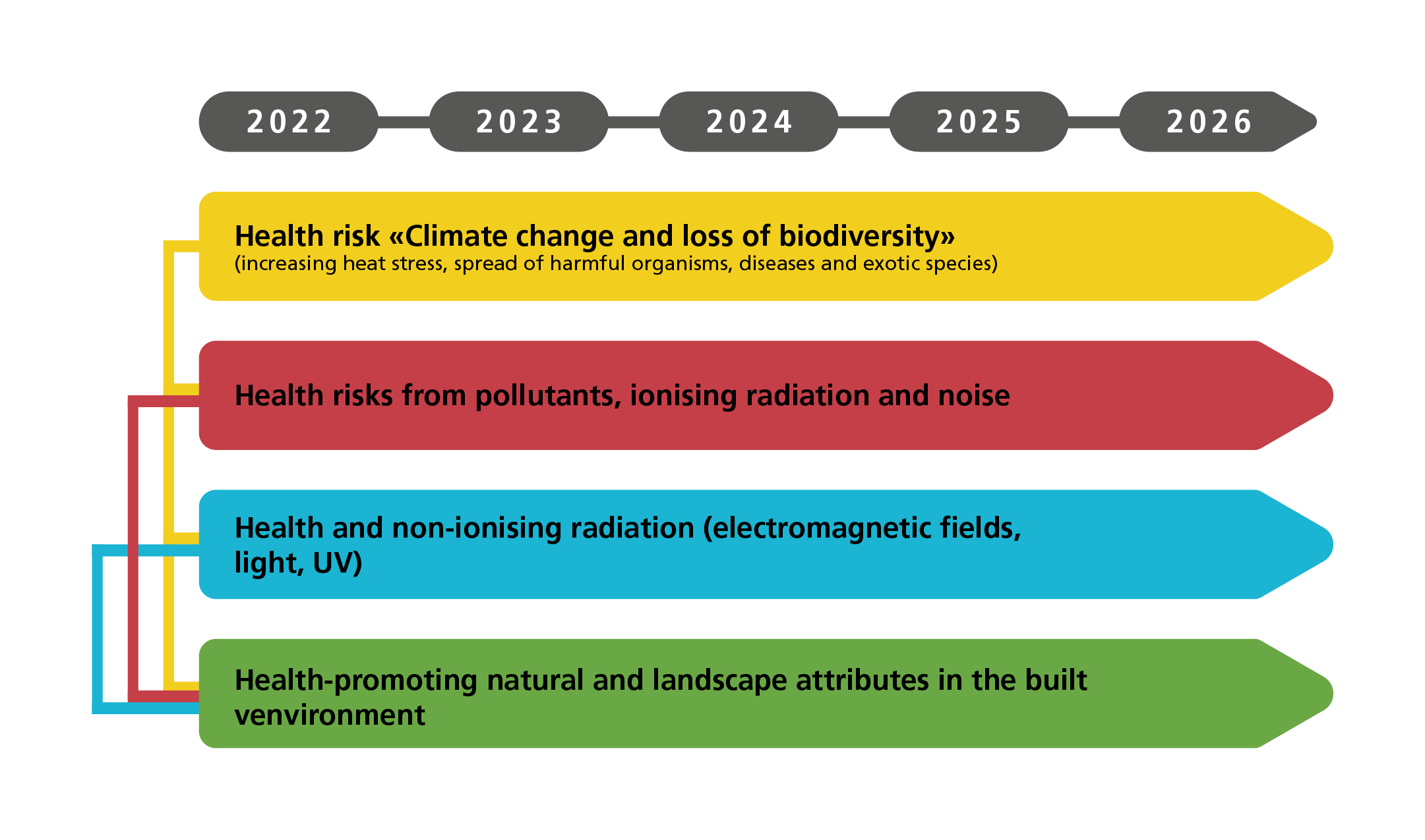 The Environment and Health Roadmap provides an overview of the key health-related measures, projects and Federal Council transactions of FOEN and FOPH.