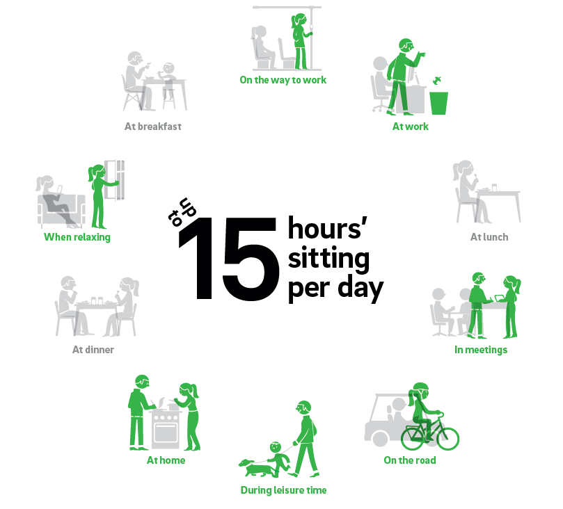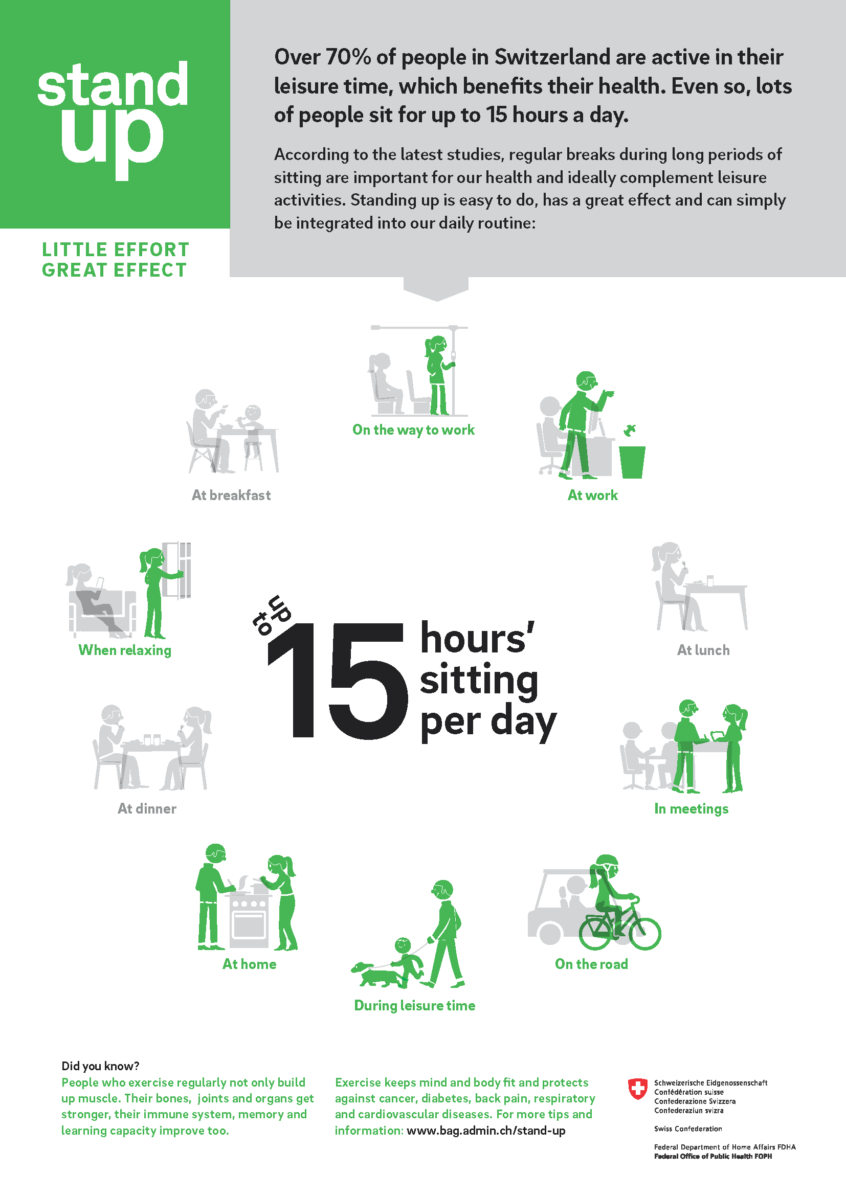 Studies shows that regular bouts of standing have a positive impact on health and ideally complement leisure activities. That’s why it’s important to regularly break up long periods spent sitting, both at work and in your own time. Standing is easy, makes a big difference to your health and can be done almost anywhere: