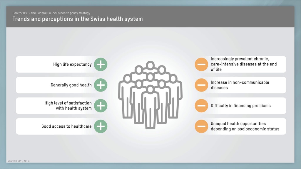 With its health policy strategy for 2020–2030, the Federal Council intends to further improve the system, so that everyone in Switzerland can continue to benefit from high-quality, affordable healthcare. Health2030 sets a framework for action in health policy, providing guidance for all health system actors.