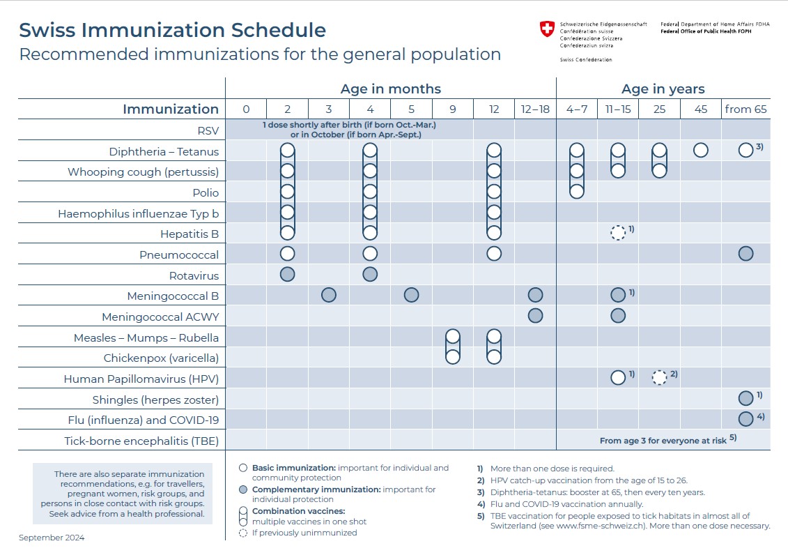The Confederation, together with the cantons and other stakeholders, has drawn up a National Immunisation Programme (NIP) with the aim of guaranteeing that the population is sufficiently protected from vaccine-preventable diseases.