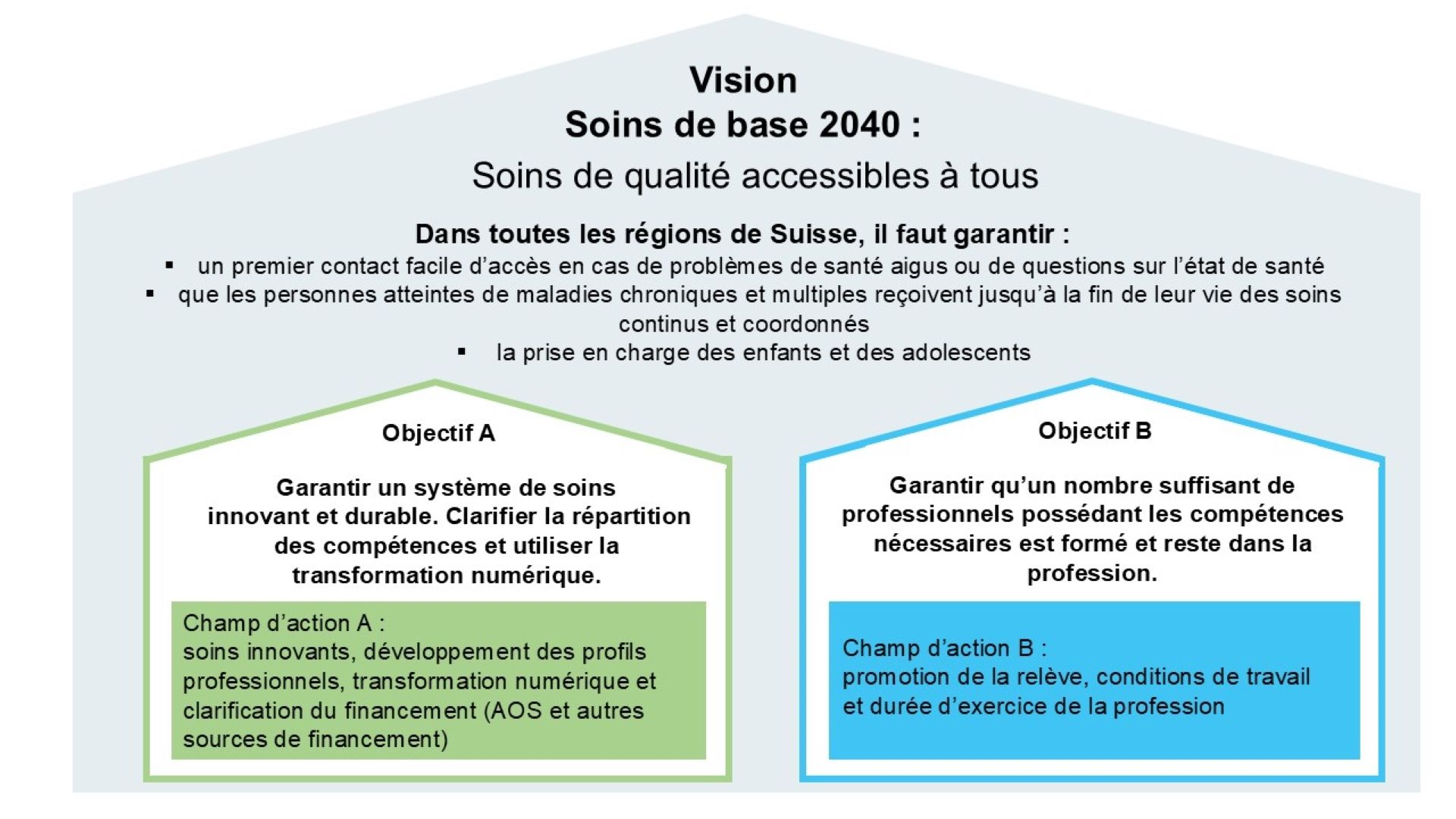 Les travaux relatifs à l’Agenda reposent sur la vision suivante : des soins de base* de qualité sont accessibles à tout le monde dans toutes les régions de Suisse. Il s’agit de veiller aux éléments suivants :