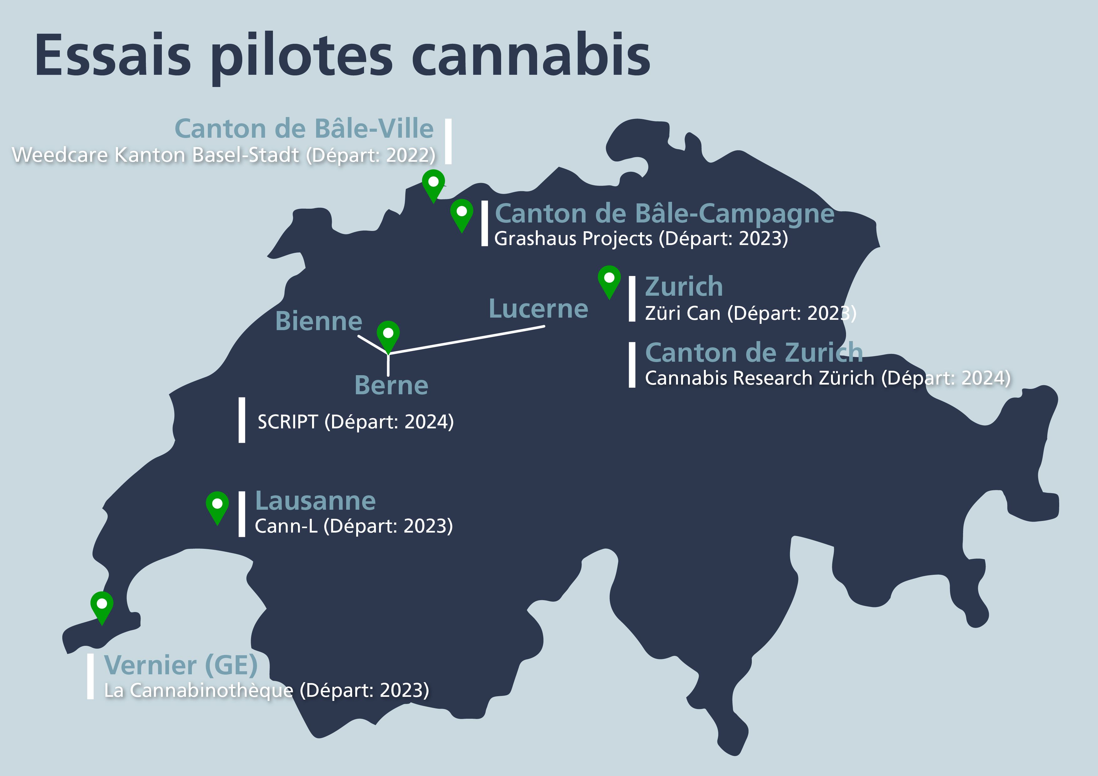 En Suisse, des essais pilotes sur le cannabis sont planifiés dans toutes les grandes villes. Les divers organisateurs prévoient de remettre du cannabis dans les pharmacies, dans les social clubs, dans les magasins à but non lucratif et à travers d’autres canaux de distribution. Ces essais pilotes permettent entre autres de comparer différents systèmes de distribution et montrent quels modèles de réglementation sont acceptés par les consommateurs et la population.