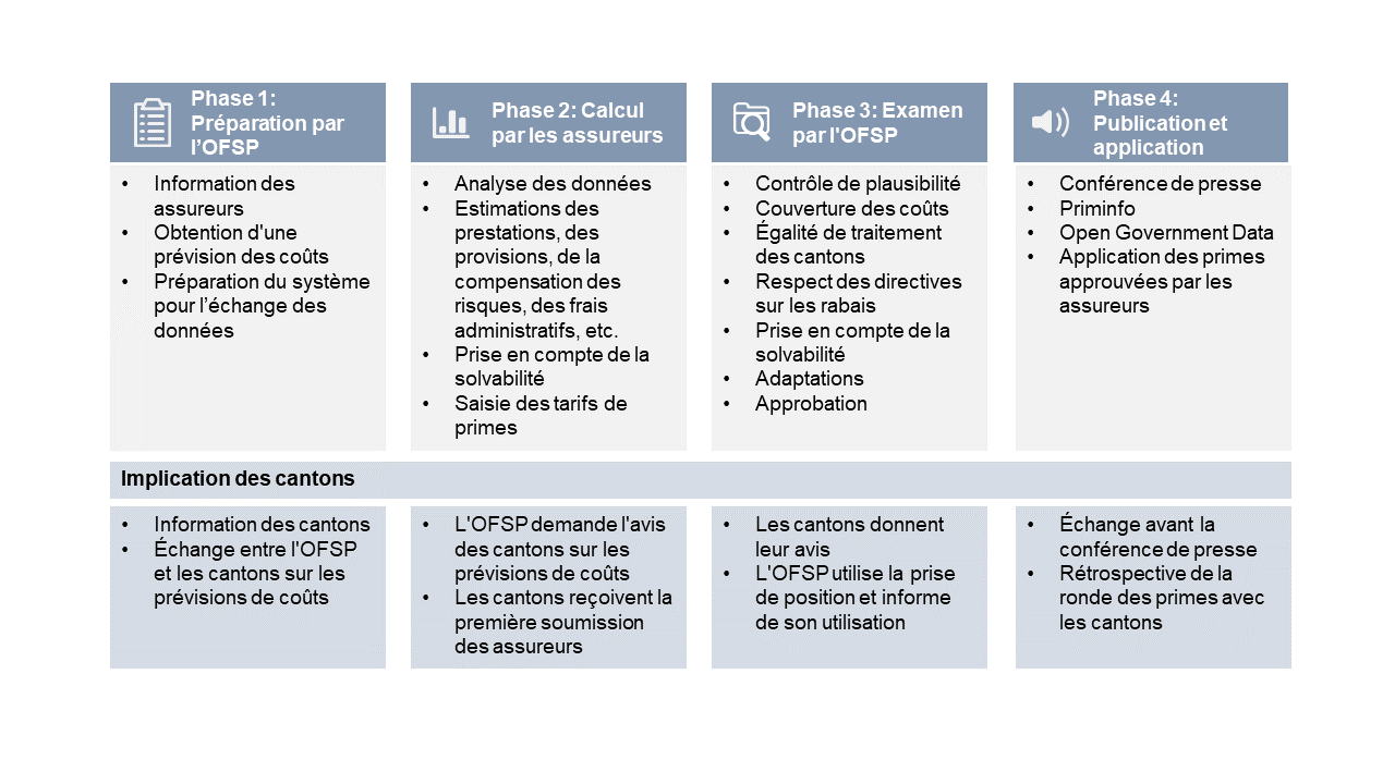 La deuxième phase correspond au calcul des primes par les assureurs.Outre l’estimation des prestations, ceux-ci doivent prendre en compte plusieurs facteurs d’influence tels que les possibles changements des personnes assurées, la compensation des risques, la solvabilité et les frais d’administration. Ensuite, les assureurs soumettent à l’OFSP les primes calculées et les calculs correspondants.