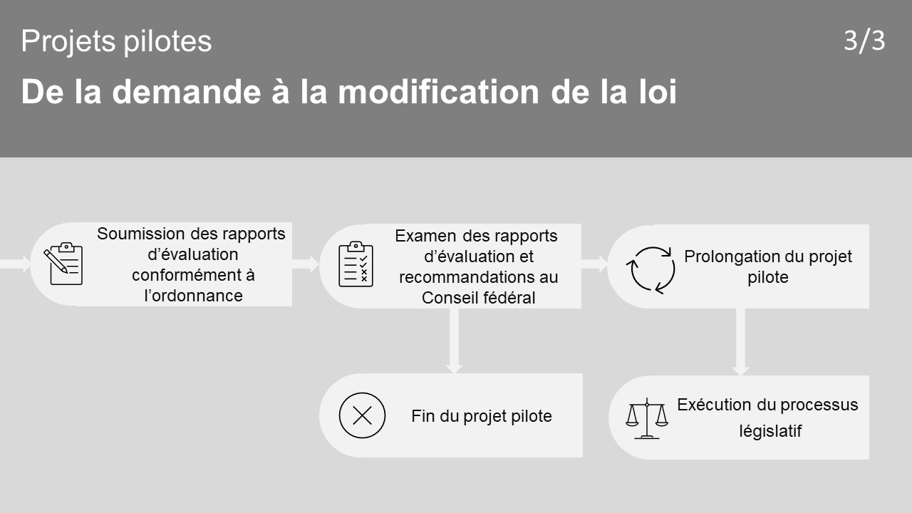 Si l’évaluation permet de déterminer que le but visé a été atteint, la durée du projet pilote pourra être prolongée, et la procédure parlementaire relative à la modification de la loi correspondante sera auquel cas initiée.