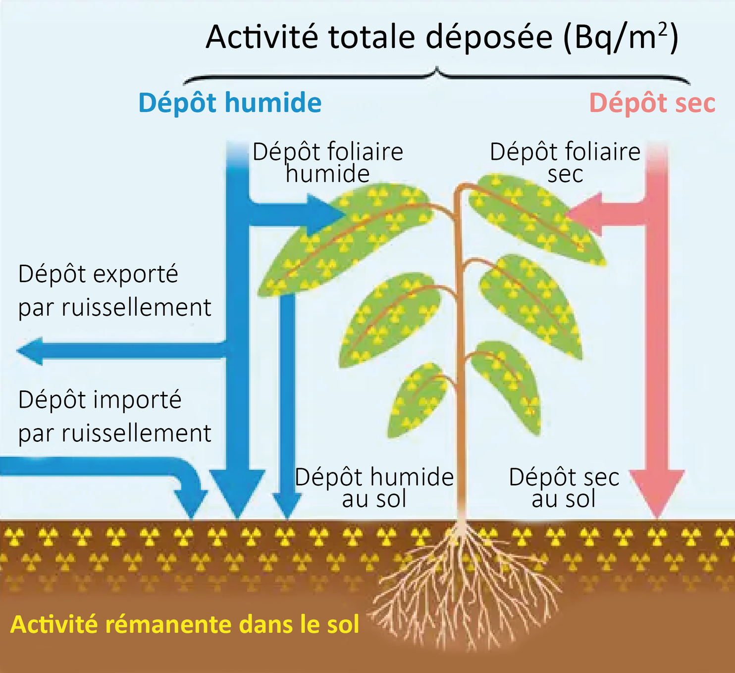En cas de dépôt sec, ce sont surtout les parties des plantes comme les feuilles ou les fruits qui sont touchées, alors qu'en cas de dépôt humide, la radioactivité se dépose principalement sur le sol. L’importance relative de ces mécanismes dans la contamination des végétaux dépend également du type de radioactivité (radionucléides présents) ; ainsi la déposition sèche d’iode est beaucoup plus importante que celle de césium par exemple.
