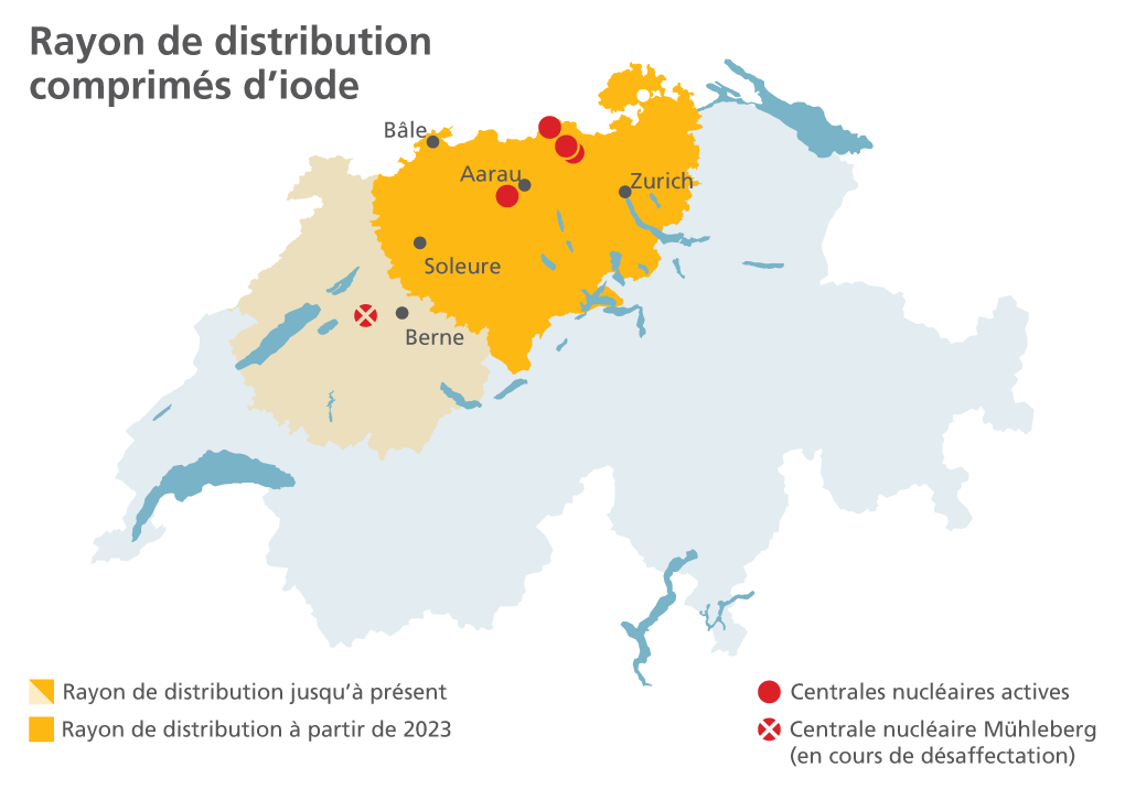 La centrale nucléaire de Mühleberg ayant été retirée du réseau en 2019, de nombreuses communes des régions de Berne, Soleure, Fribourg, Neuchâtel et Vaud ne se trouvent plus dans le rayon de pré-distribution de 50 km. Désormais, les comprimés d’iode n’y seront donc plus distribués à titre préventif. À la place, ils seront stockés par les différents cantons de manière à pouvoir les distribuer à temps à la population en cas d’événement.