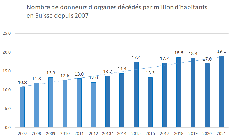 - théoriquement, la Suisse a un potentiel de 290 donneurs par an (ce qui correspond à un taux de dons de 36,5 par million d’habitants).