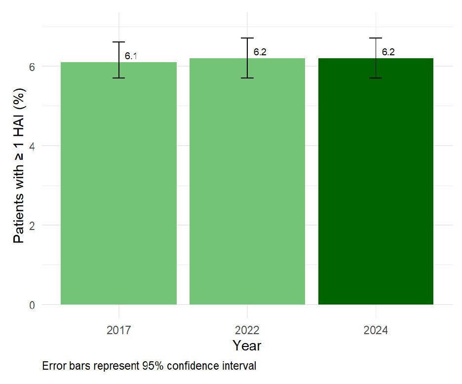 L’observation des résultats au fil du temps montre que la prévalence des IAS dans les hôpitaux suisses de soins aigus est restée constante depuis 2017.