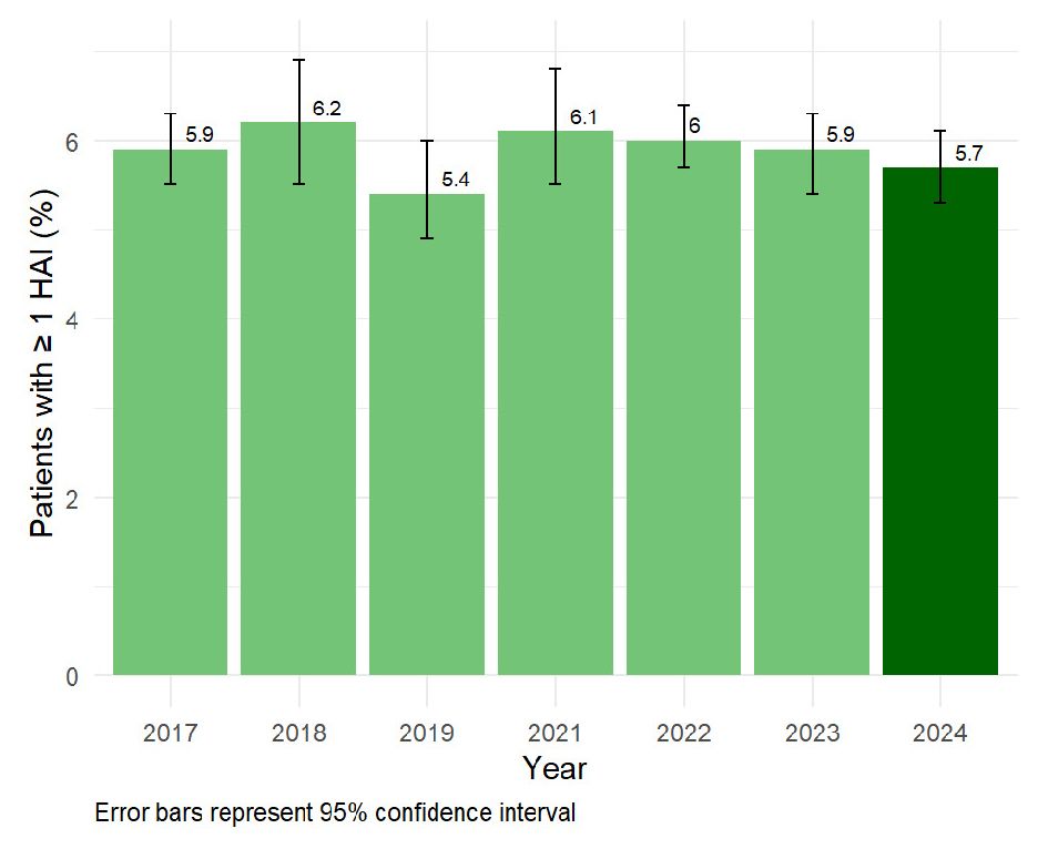 La PPS 2022-2023 de l’ECDC, qui comptait 1332 hôpitaux participants répartis dans 31 pays européens, a révélé que 7,1 % des patients souffraient d’une IAS. Avec une prévalence de 5,7 % en 2024, la Suisse se situe légèrement en dessous de la moyenne européenne (Récolte de données auprès de 12'414 patients dans 103 hôpitaux).
