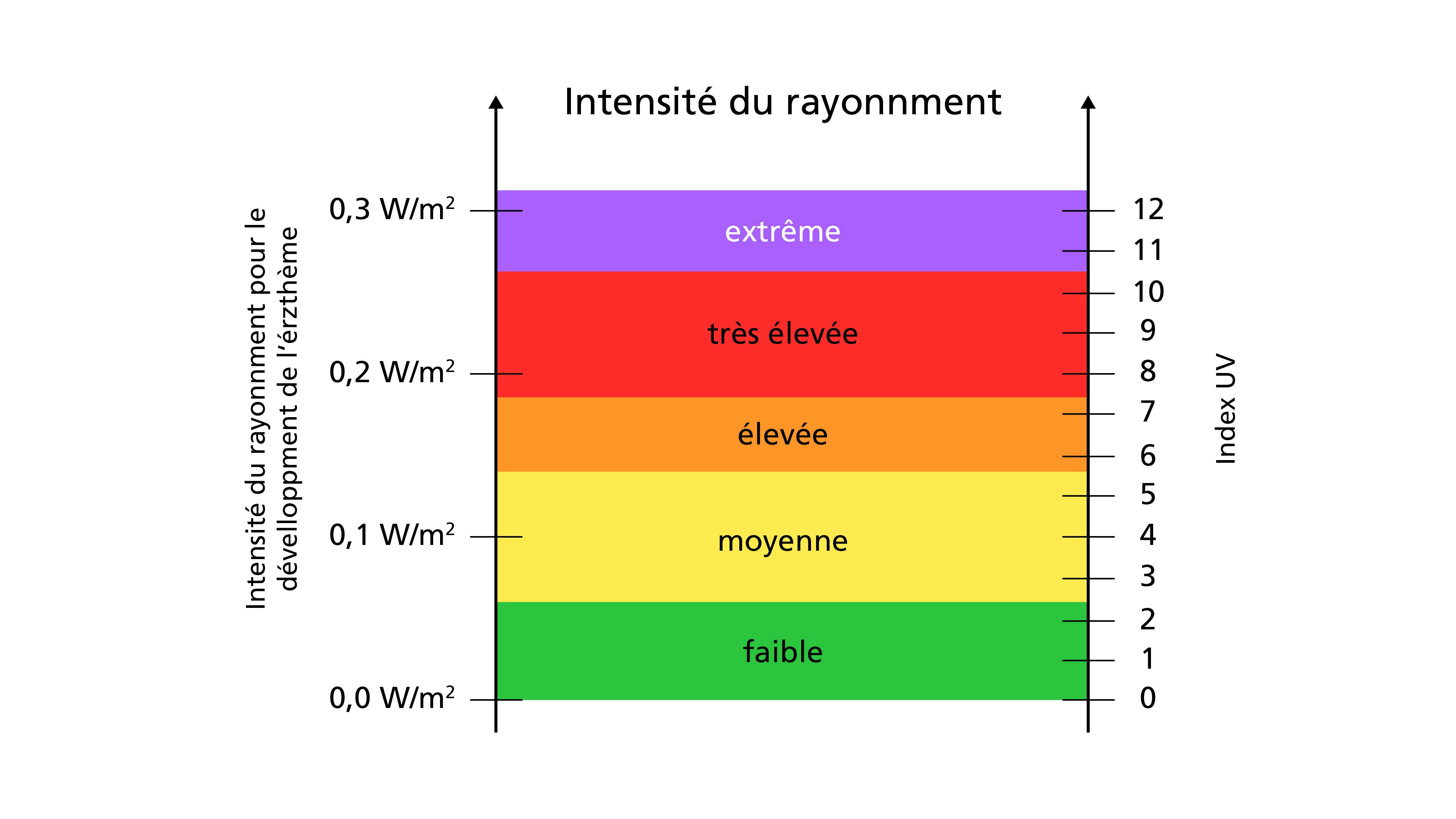 Le nombre de l'indice UV est calculé en multipliant l'intensités de rayonnement UV responsable de l’érythème (effet brûlant du soleil) par le facteur 40 (m2/W).