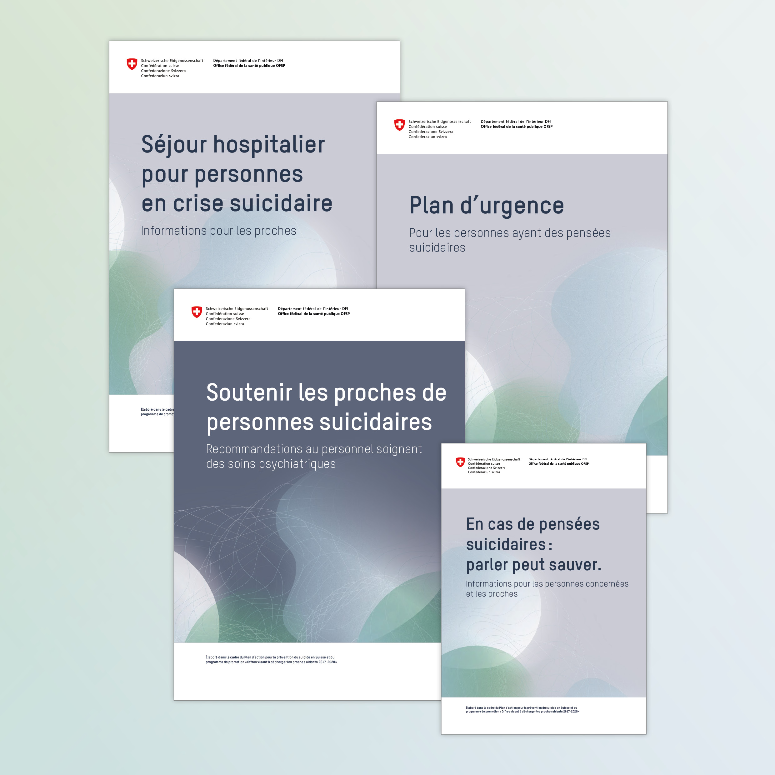 Le lien ci-dessous vous permet de télécharger les brochures sur la prévention du suicide ou de commander gratuitement les versions imprimées auprès de l’OFCL. Veuillez noter que les versions imprimées sont plus attrayantes, notamment pour l'utilisation des cartes d'urgence.