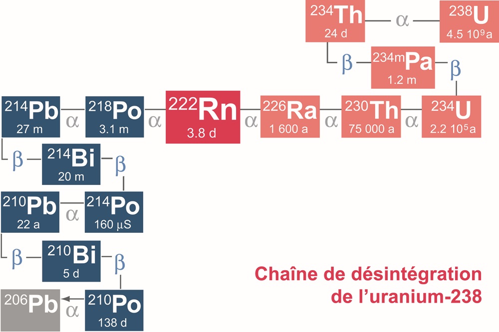 Le radon est présent dans la chaîne de désintégration de l’uranium, qui est présent partout dans le sol. La désintégration naturelle de l’uranium engendre entre autres le radium et le radon. Les atomes de radon peuvent se désintégrer à leur tour pour donner du polonium, du bismuth et du plomb. Ces « produits de désintégration » sont aussi radioactifs et s’associent aux aérosols de l’air que nous respirons. Dans les espaces clos, ils s’accumulent peu à peu. Lors de la respiration, il peuvent pénétrer dans les poumons, se déposer sur le tissu pulmonaire et l’irradier avec pour conséquence possible un cancer du poumon.