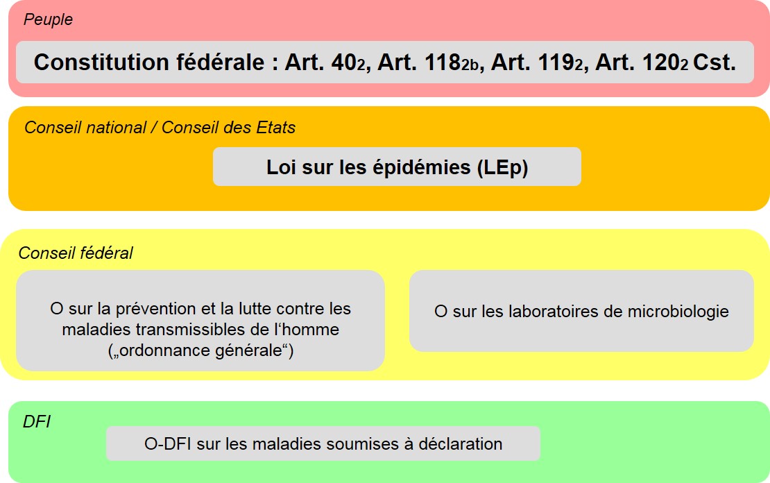 La loi fédérale du 28 septembre 2012 sur la lutte contre les maladies transmissibles de l’homme (loi sur les épidémies, LEp) est en vigueur depuis le 1er janvier 2016 et règle la détection précoce, la surveillance, la prévention et la lutte dans ce domaine.