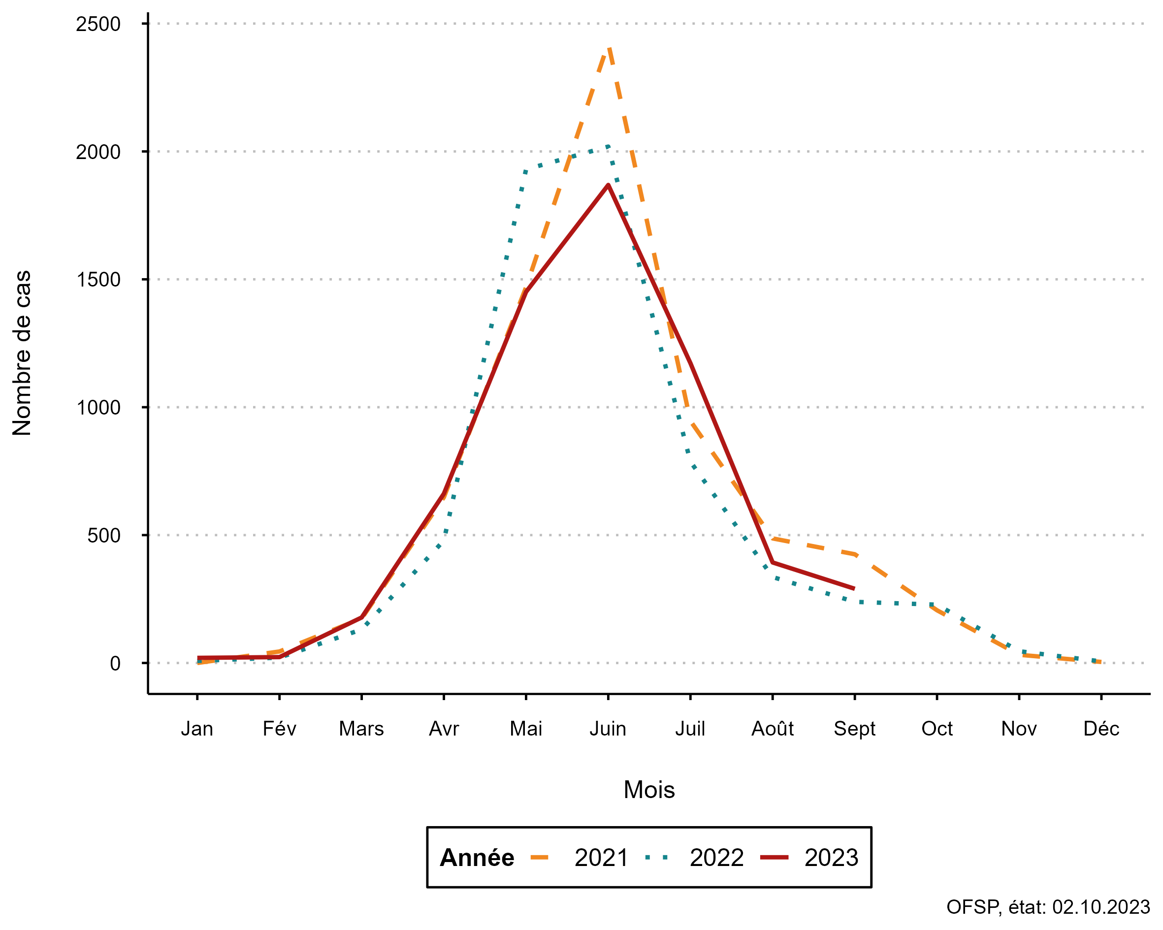 13 cas ont ainsi été enregistrés au cours du mois de septembre 2023, soit un nombre de cas comparable à celui des deux années précédentes. Le nombre de cas, cumulé depuis janvier d’une année civile jusqu’au mois précédant le rapport, fluctue considérablement d’année en année (figure 2). Depuis l’année 2000, entre 48 et 409 cas ont été déclarés pendant cette période. De janvier à la fin du mois de septembre 2023, 245 cas ont été déclarés (figure 2).