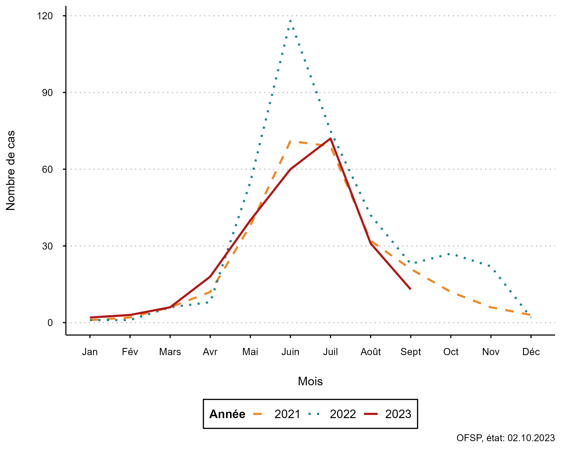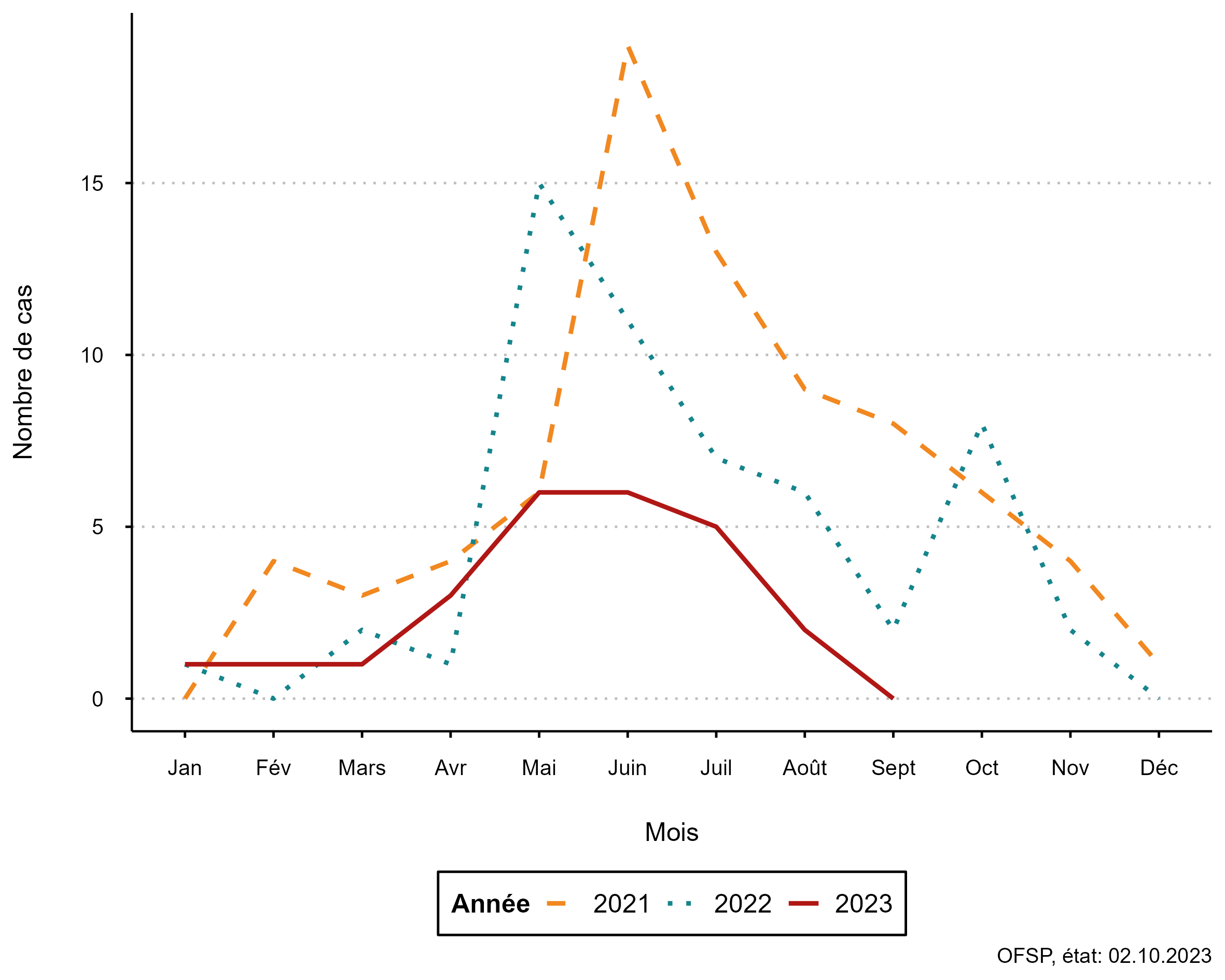 Zero cas a été enregistré au mois de septembre 2023, nettement moins que les deux années précédentes. Le nombre de cas, cumulé depuis janvier d’une année civile jusqu’au mois précédant le rapport, fluctue aussi considérablement d’une année à l’autre. Depuis 2004, entre 1 et 66 cas ont été déclarés pendant cette période. De janvier à la fin du mois de septembre 2023, 25 cas ont été enregistrés (figure 6).