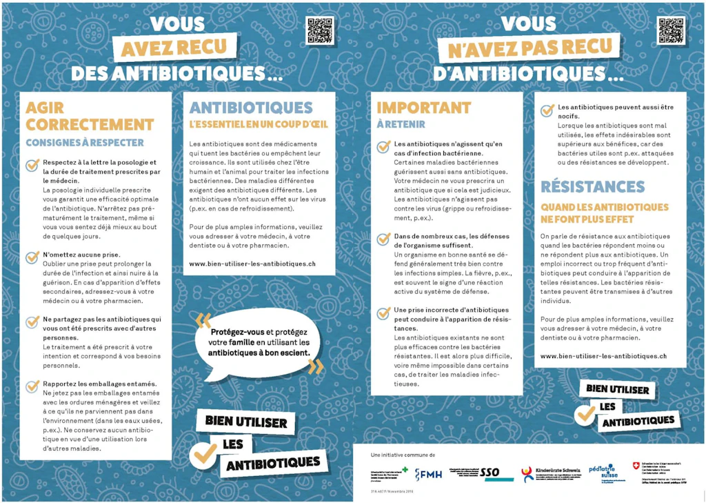 Les antibiotiques sont des médicaments soumis à ordonnance qui empêchent la croissance des bactéries ou qui les tuent. Ils n’ont aucun effet lorsque les infections sont provoquées par des virus (p. ex. grippe, COVID-19). Ils ne sont pas non plus efficaces contre le rhume, la plupart des gastro-entérites, les champignons (mycoses) ou les parasites (p. ex. paludisme).