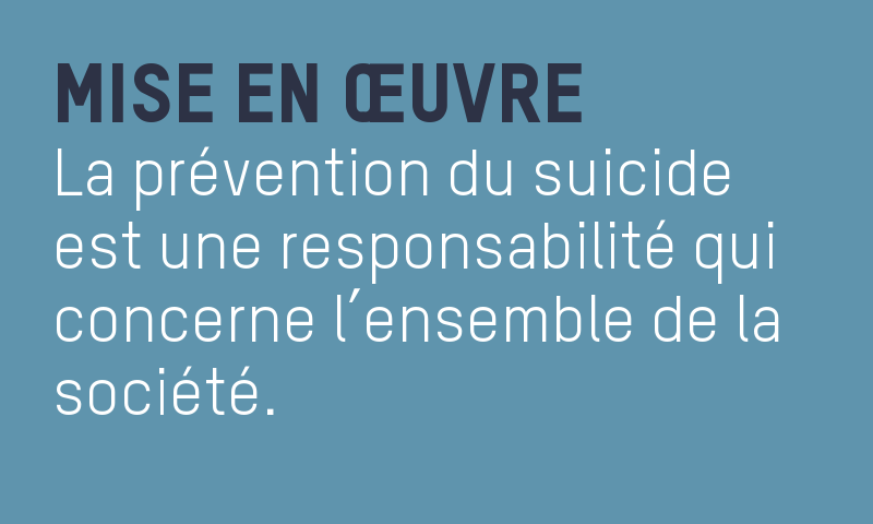 La Confédération, en collaboration avec d’autres acteurs, a élaboré le plan d’action pour la prévention du suicide adopté en 2016. Celui-ci a pour objectif de réduire les actes suicidaires lors d’une réaction aiguë à un facteur de stress ou en cas de maladie psychique telle que la dépression.